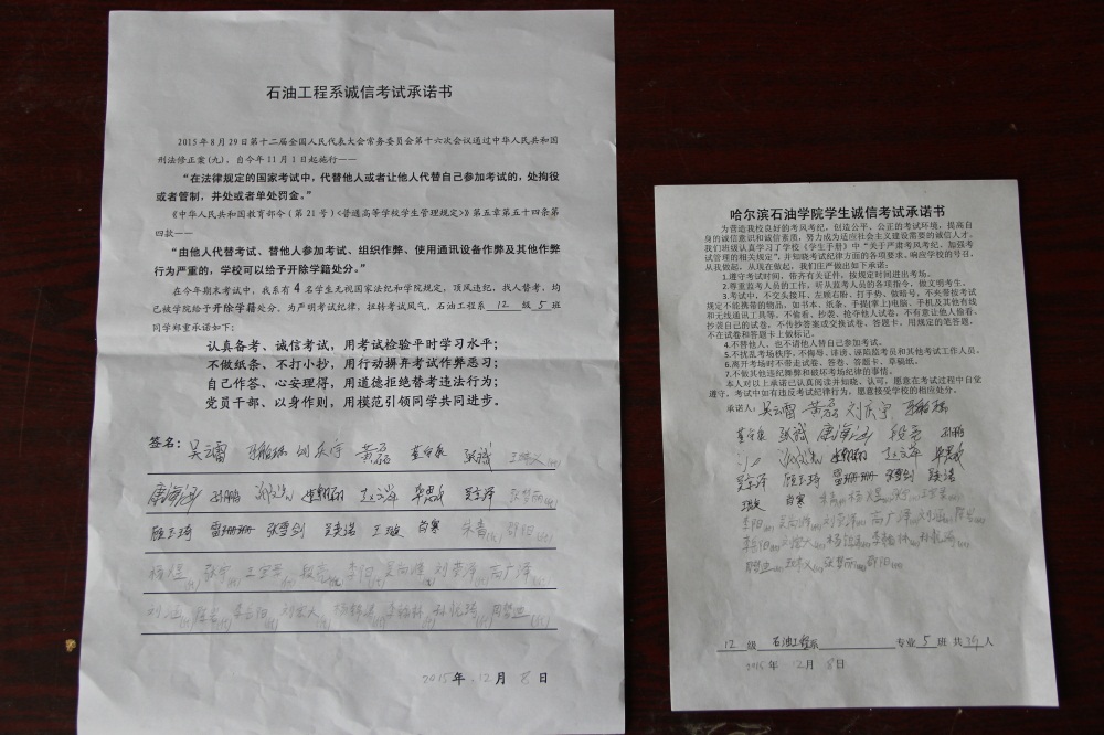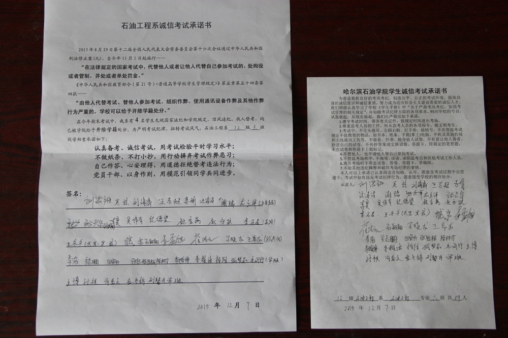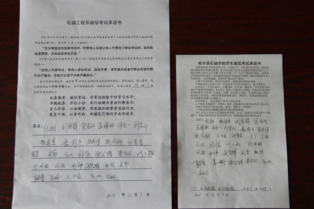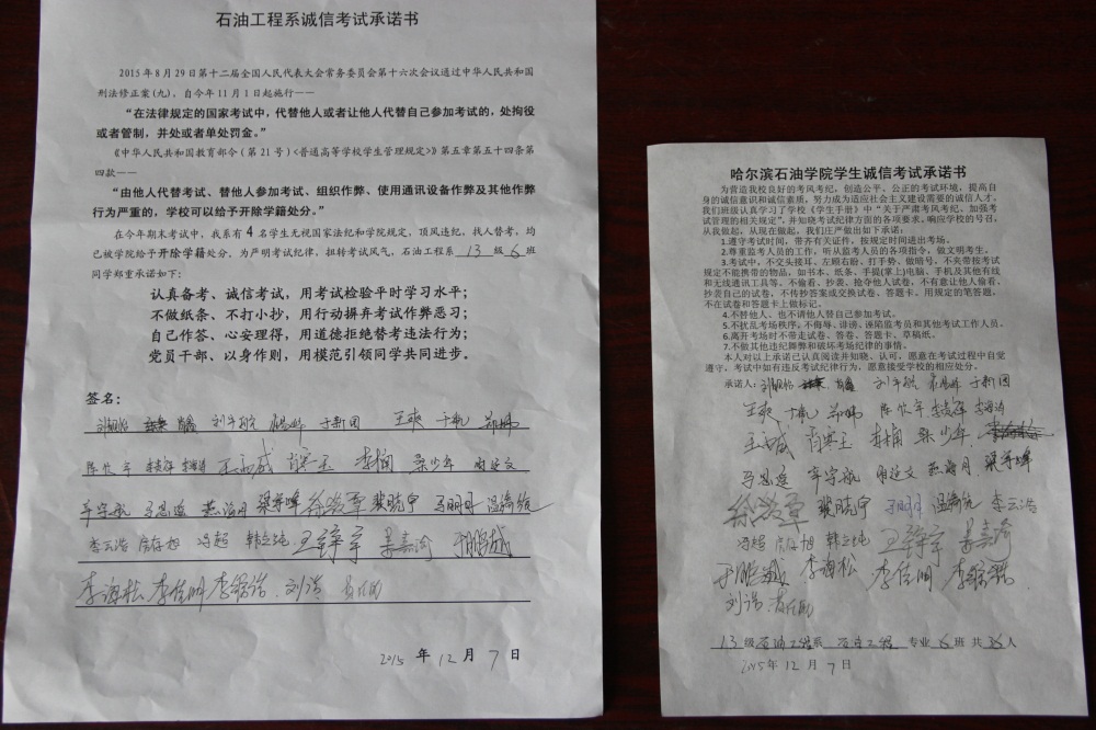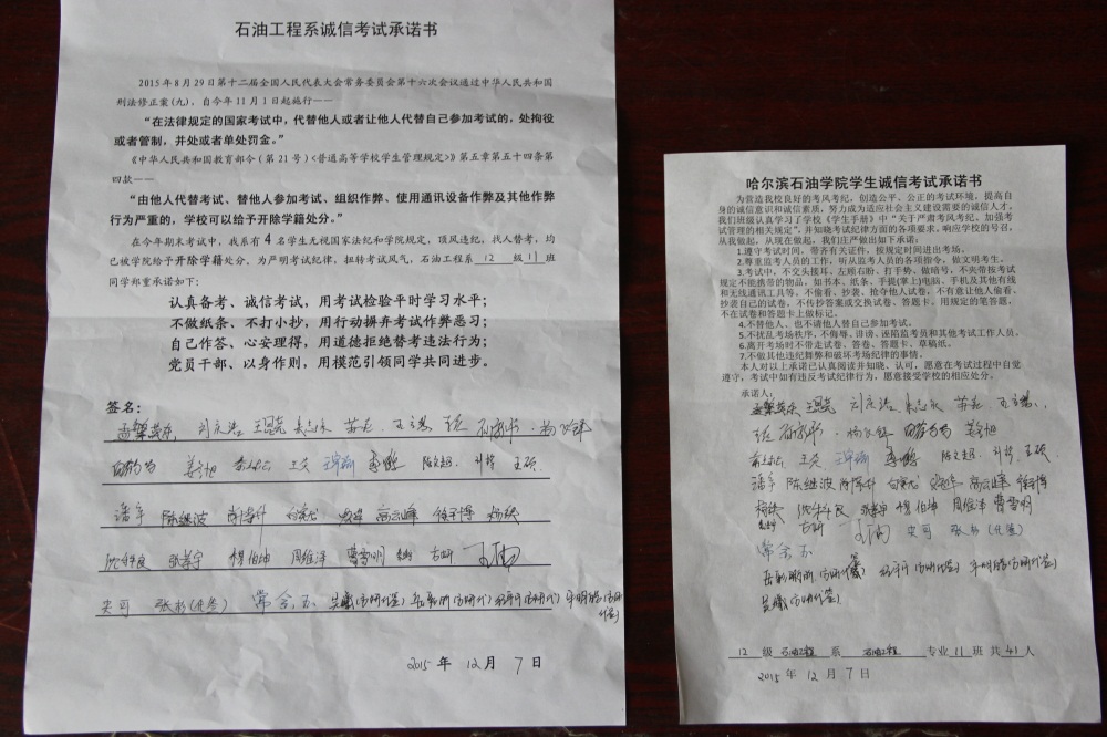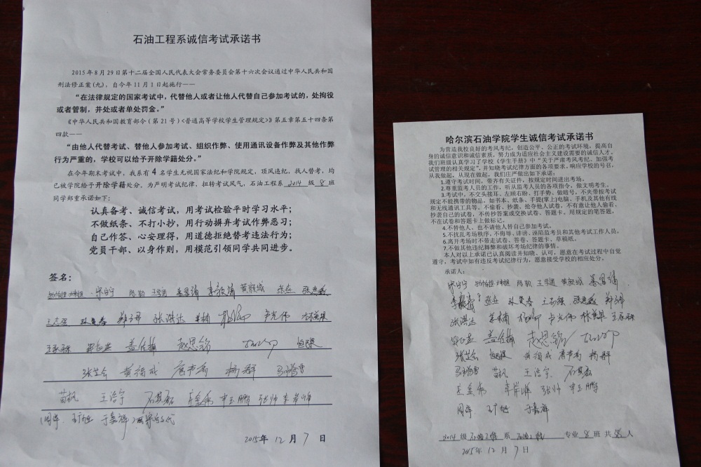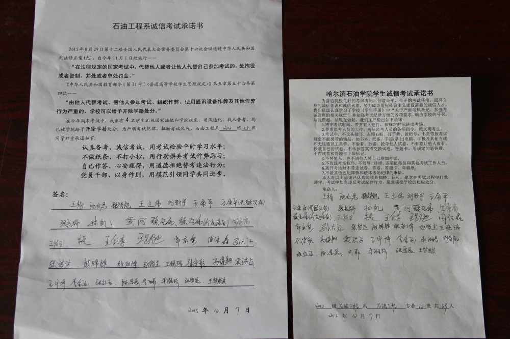 石油工程系要求班级每名学生同时在学院和系印发的考试承诺书上签名,在外实习的学生也要指定专人代替签字,做到不漏一人。同时,在考试这项工作上做到“两个绝不”:在考试违纪的问题上,绝不包庇护短,绝不回避问题。对出现问题的学生,坚决支持学院有关部门依纪依规做出严肃处理,为学院学风考风建设保驾护航。