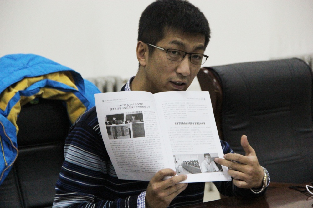 会上,顾部长首先对石油工程系自主编辑的系刊《油迹》给与了充分肯定,并对系刊的编辑提出了宝贵的意见和建议。随后两个部门的学生干部则针对自己工作中遇到的问题和困惑,向两位老师进行了询问。宣传部的同学主要就系内的活动宣传、宣传形式以及如何拓宽宣传阵地等方面与顾部长展开交流。新闻部的学生干部则针对新闻稿件的撰写、人物采访的细节、微信微博平台建设等内容虚心向两位老师请教。两位老师,对同学们提出的问题,逐一给与了耐心和细致的解答,同时给出了许多优秀的工作方法和工作经验。