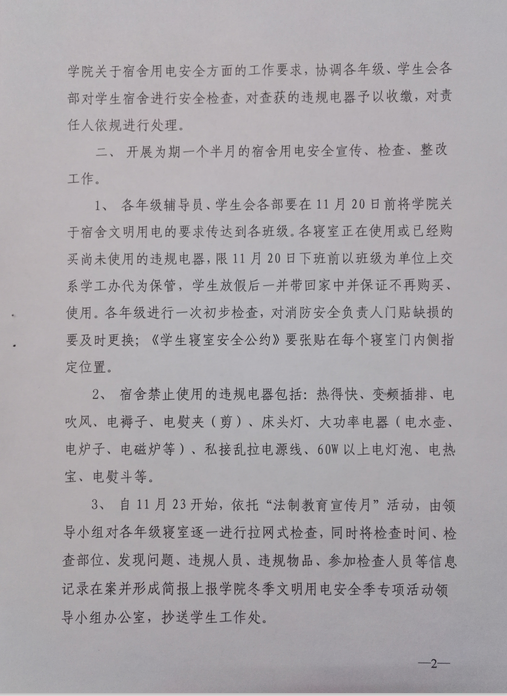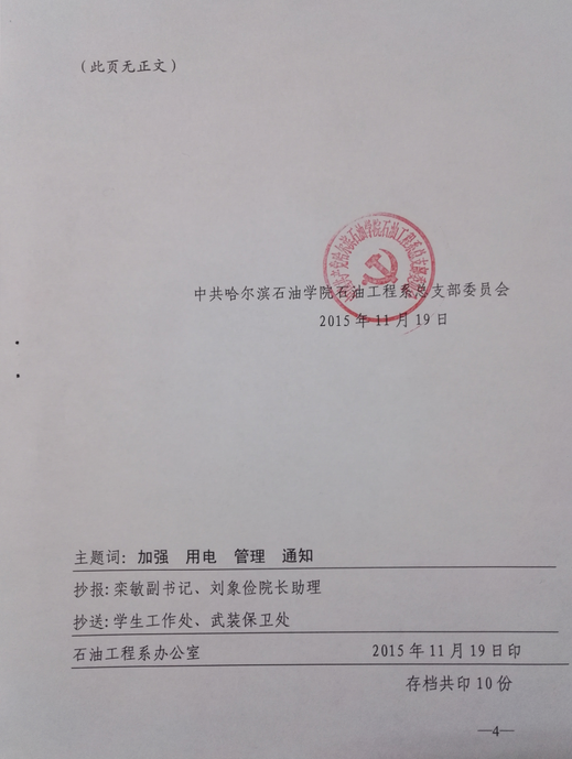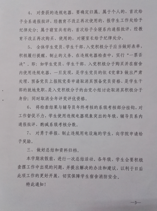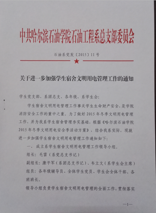 会上,毛雷向同志们下发了石油系党发【2015】11号文件《关于进一步加强学生宿舍文明用电管理工作的通知》,《通知》要求系学生党支部、系团总支、各年级以及系学生会要高度重视学生宿舍文明用电管理工作,加强对学生的宣传教育工作,增强同学们的消防安全意识。同时要求各年级、学生会要做好对学生宿舍违规电器的自检自查工作,加大对学生宿舍的检查管理力度,依托学院“冬季文明用电安全季”和系“法制教育宣传月”的各项活动,切实做好学生宿舍文明用电管理工作,力争在全系学生宿舍中,违规电器零使用,不文明用电现象零发生。