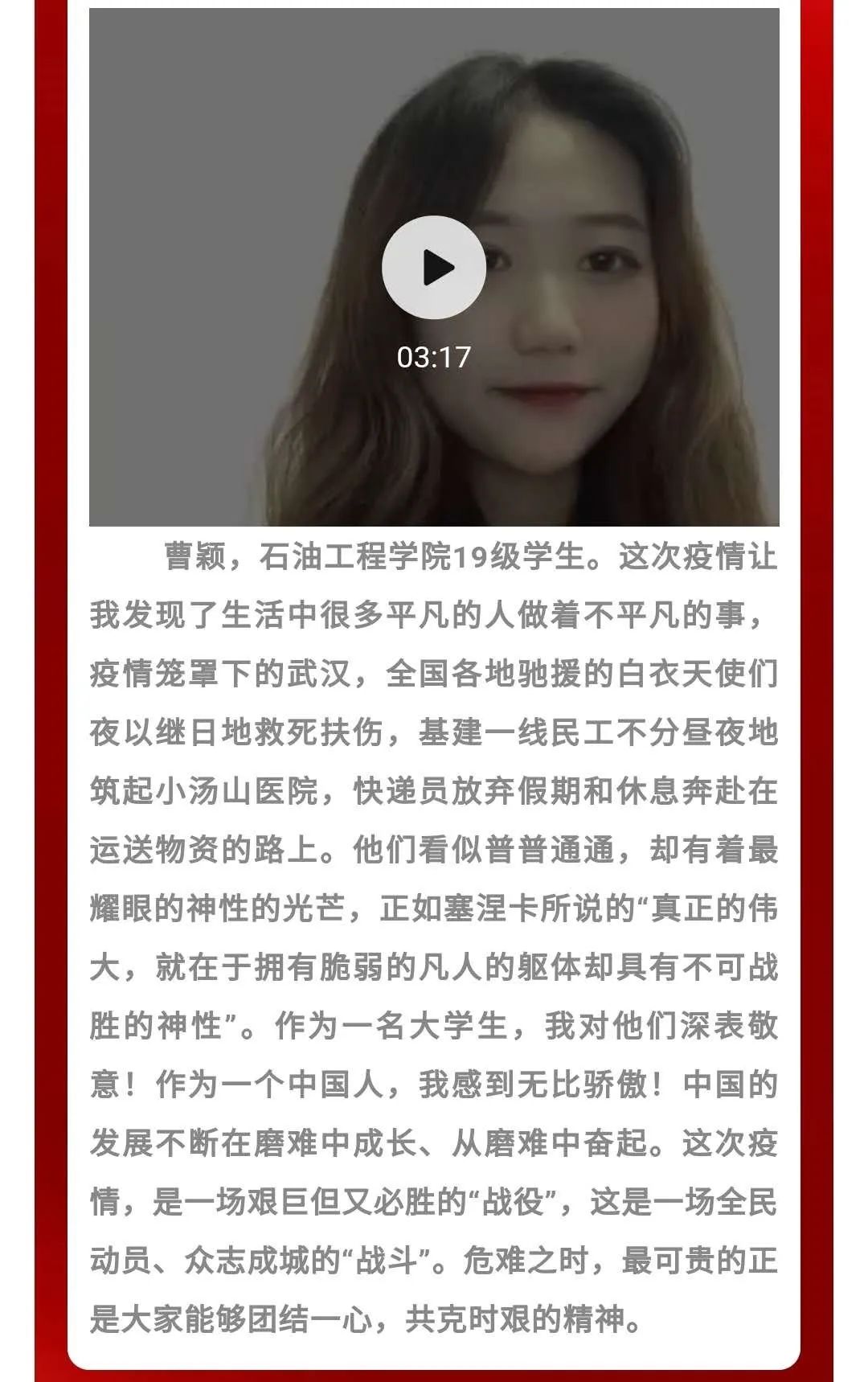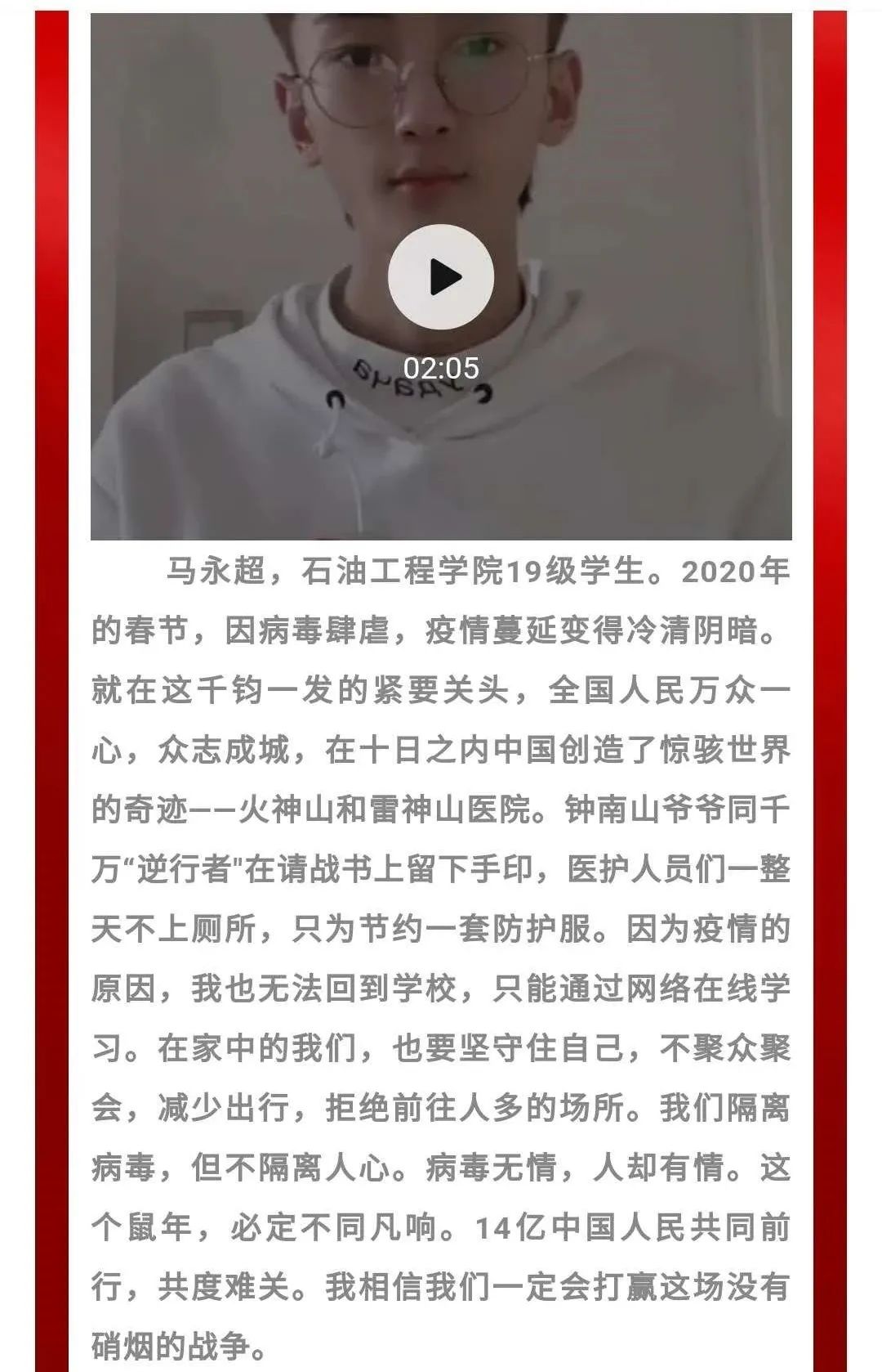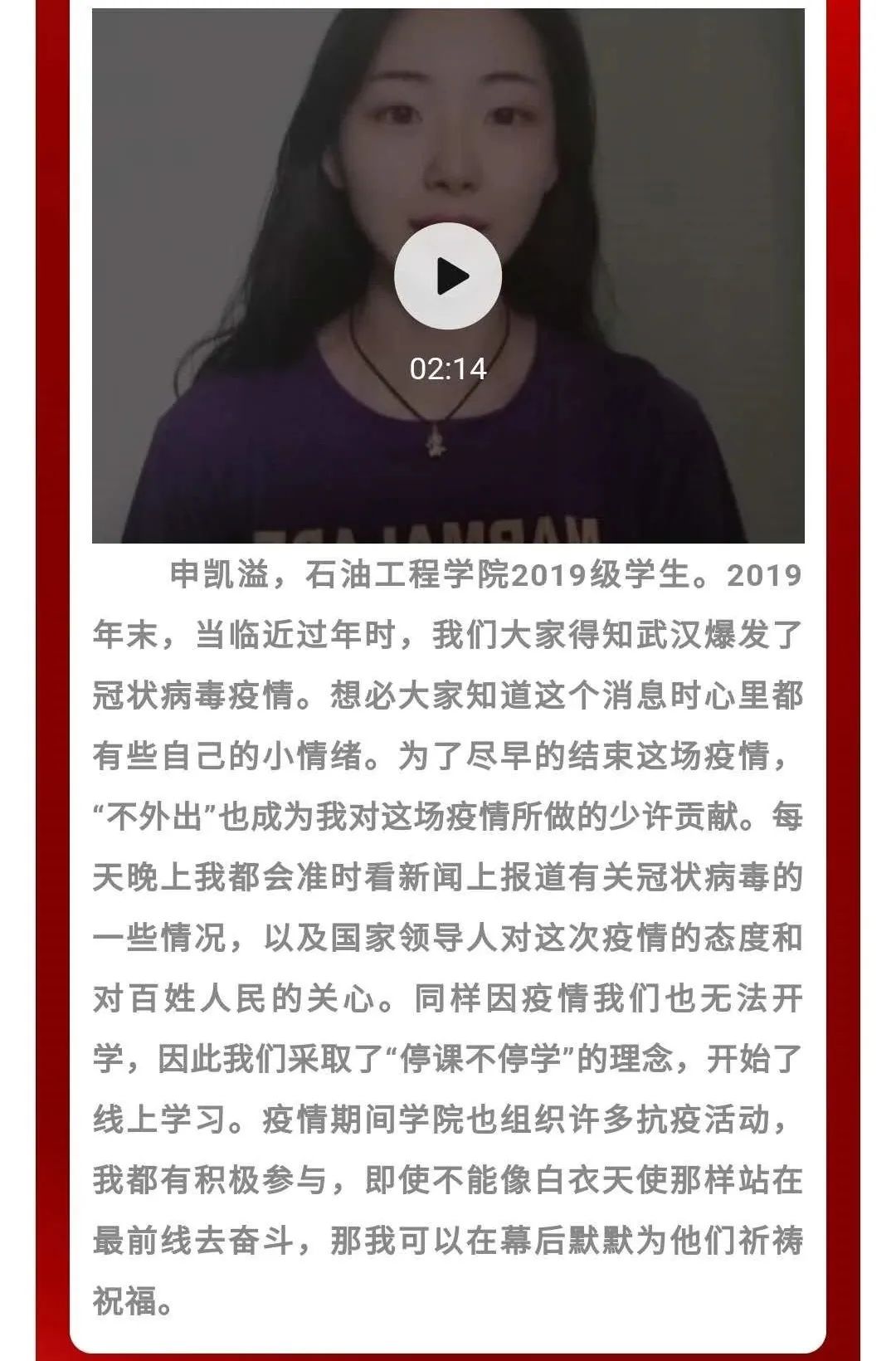 在疫情期间同学们向我院师生传递与抗疫有关的个人故事,让大家更加了解疫情防控人员的辛苦,明确疫情防控工作的重要性。在丰富同学疫情期间文化生活的同时,也提高了学生的语言组织能力,锻炼了学生的综合素质。
