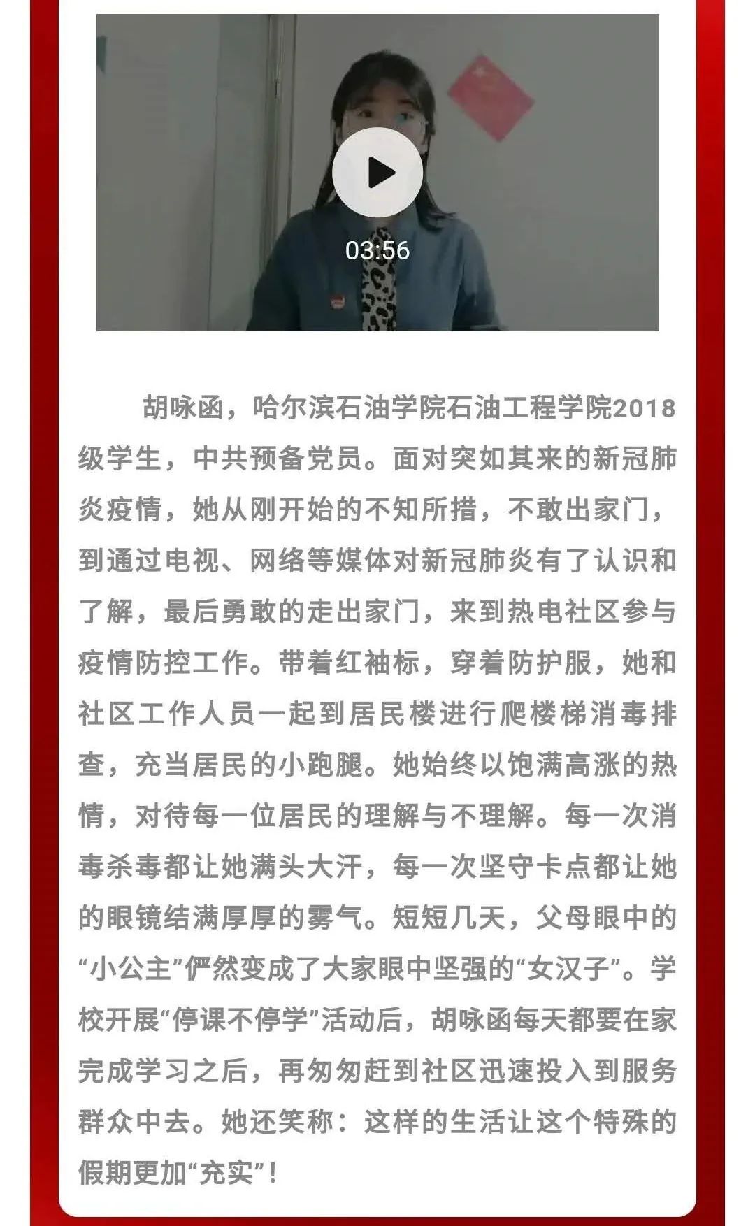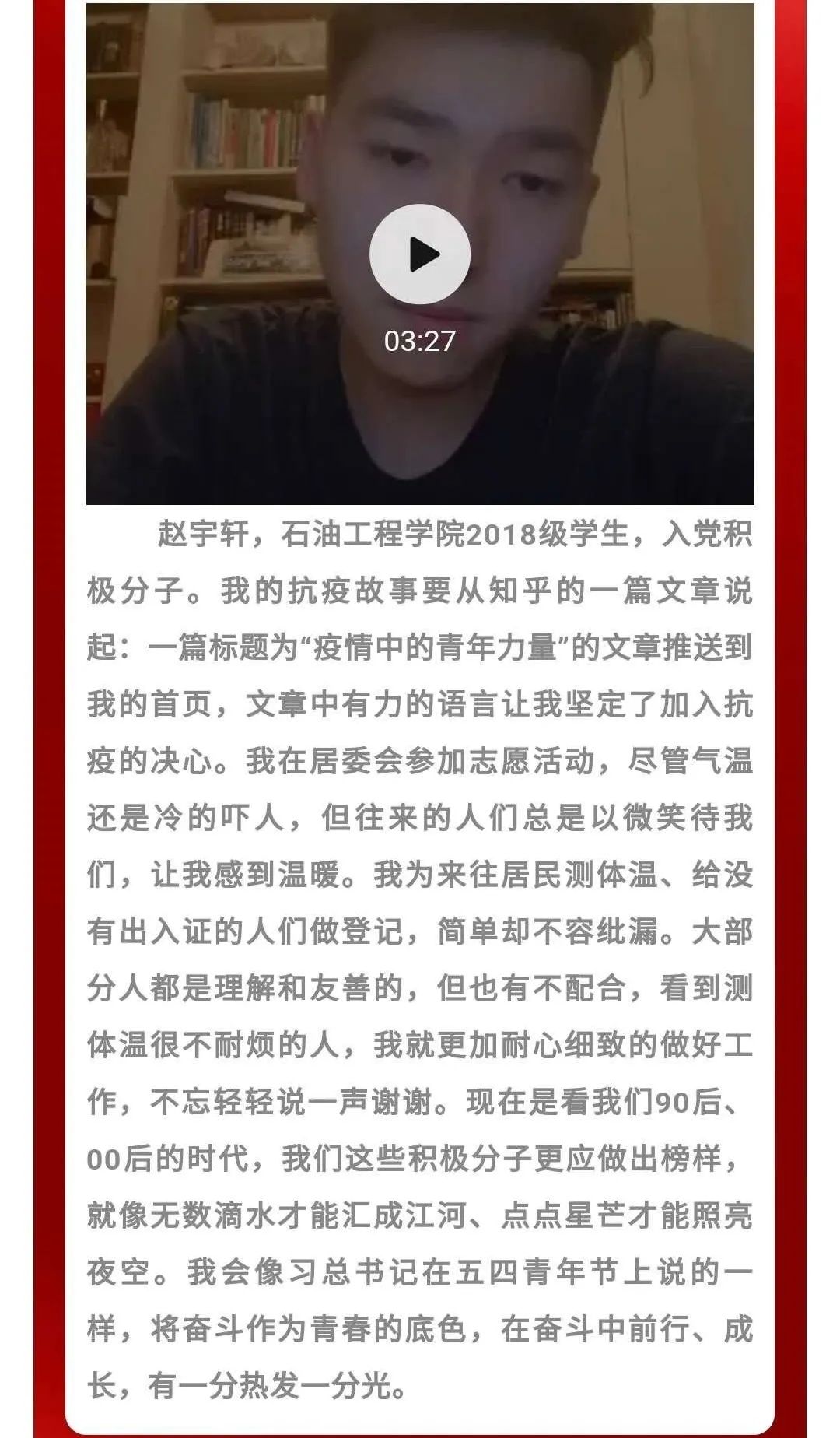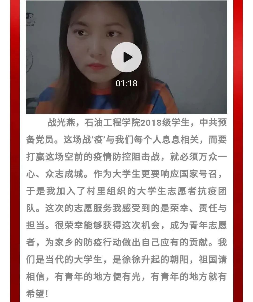 在疫情期间同学们向我院师生传递与抗疫有关的个人故事,让大家更加了解疫情防控人员的辛苦,明确疫情防控工作的重要性。在丰富同学疫情期间文化生活的同时,也提高了学生的语言组织能力,锻炼了学生的综合素质。