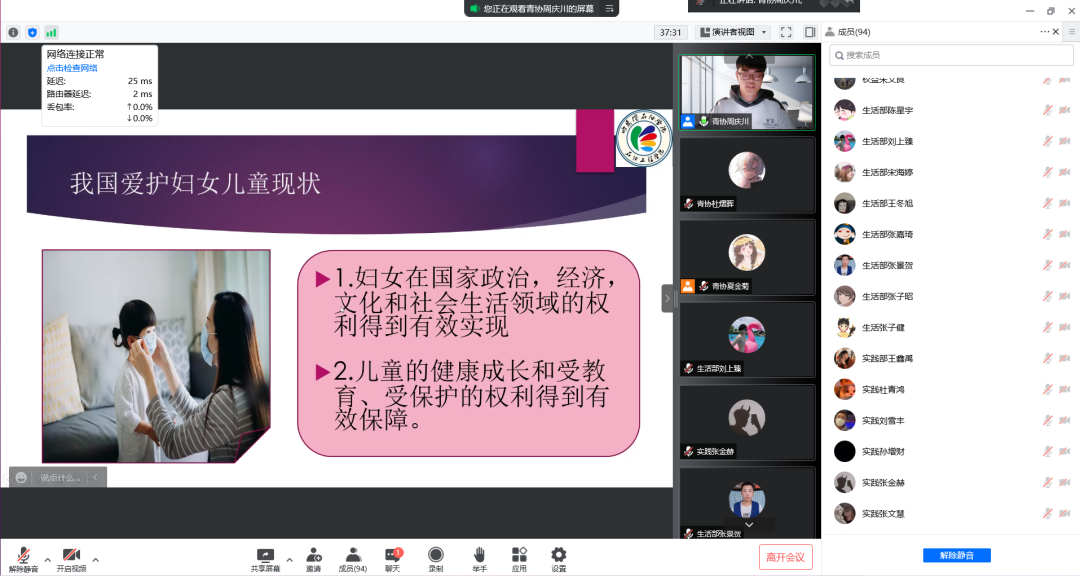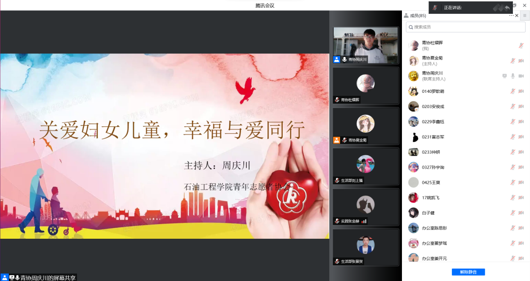 为弘扬爱护妇女儿童精神,促进社会和谐发展、身心全面发展,培养同学们爱护妇女儿童能力,提高爱护妇女儿童思想。5月8日,金沙检测线路js69石油工程学院于腾讯会议线上开展以 “关爱妇女儿童,幸福与爱同行”为主题的观影活动,党总支副书记&团总支书记张雪出席此次活动,活动参与人员共计131人。