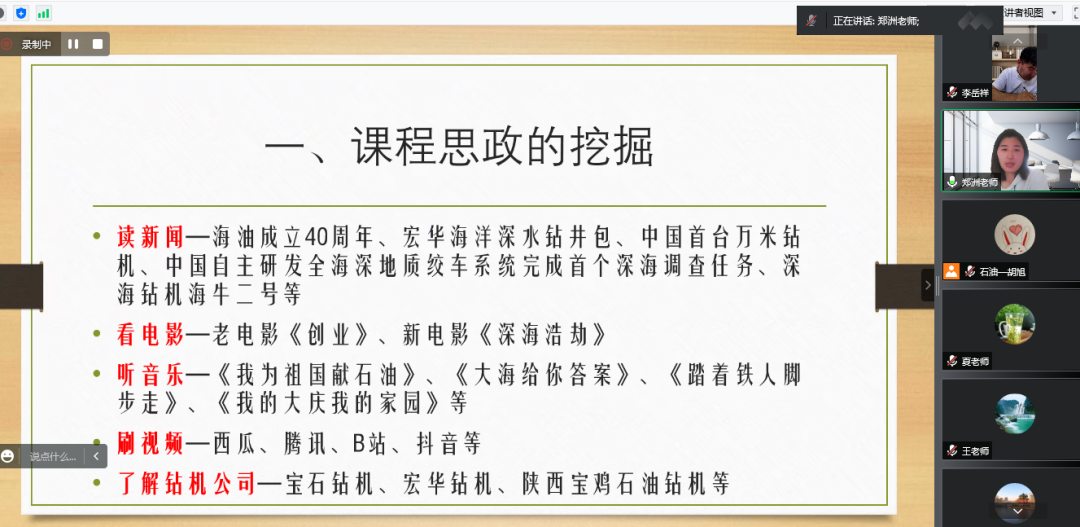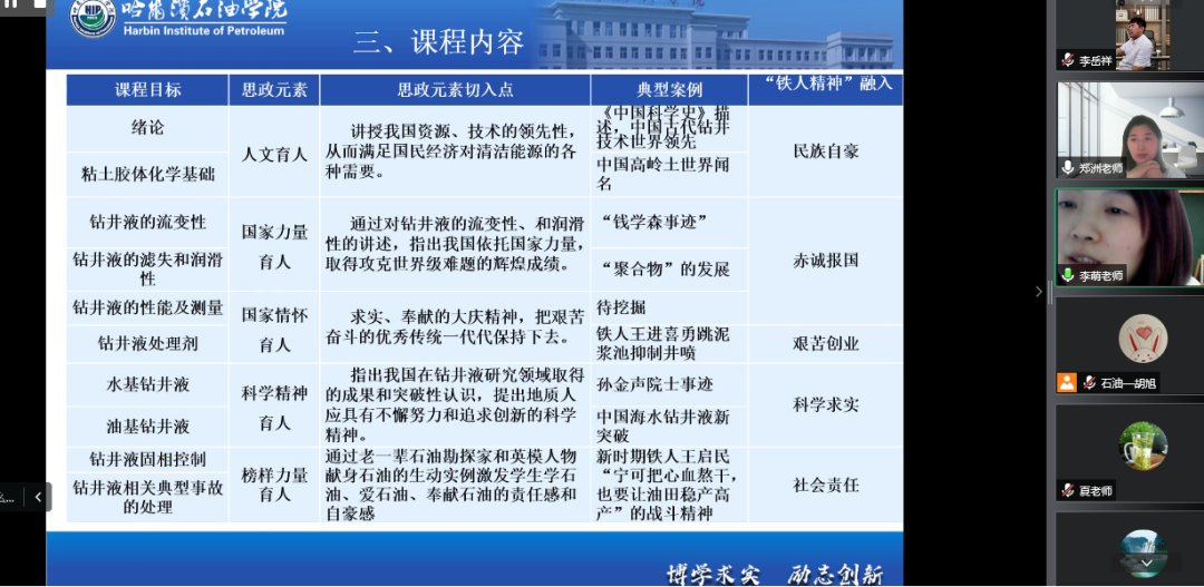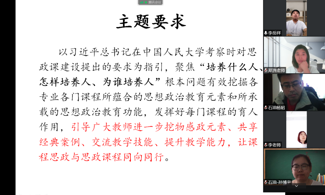 根据“以习近平总书记在中国人民大学考察时对思政课建设提出的要求为指引,聚焦‘培养什么人、怎样培养人、为谁培养人’根本问题有效挖掘各专业各门课程所蕴含的思想政治教育元素和所承载的思想政治教育功能。发挥好每门课程的育人作用,引导广大教师进一步挖掘感政元素、共享经典案例、交流教学技能、提升教学能力,让课程思政与思政课程同向同行。”以上要求。2022年6月7日下午,石油工程系组织开展“课程思政学习交流线上分享会”,会议由石油工程系主任胡旭老师主持,会上各位教师积极发言,共享教学典型案例,充分交流思政心得。