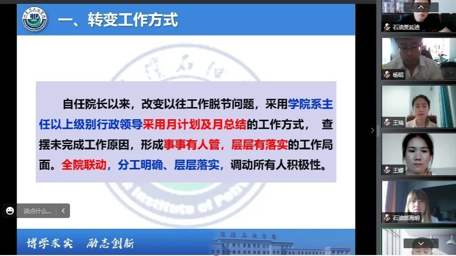 最后,校长柴维斯发表重要讲话。她指出,石油工程是学校的传统优势特色专业,是省级一流本科建设点,石油工程学院要不断加快发展,加强教学类成果的梳理,教职工不仅仅要通过述职回顾一年来的工作情况,更要在对既往工作的总结中,提高理性认识。