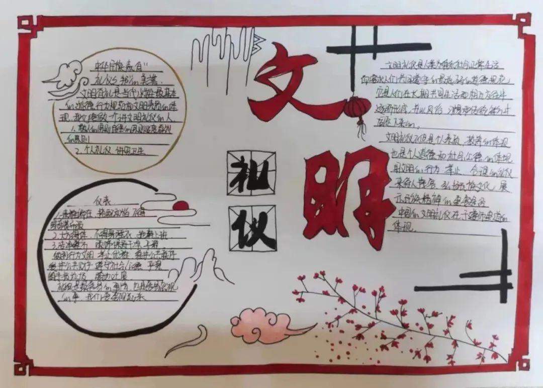 手抄报设计是视觉传达的表现形式之一,通过版面的构成在第一时间内将人们的目光吸引,并获得瞬间的刺激,这要求设计者要将图片、文字、色彩、空间等要素进行完整的结合,以恰当的形式向人们展示出宣传信息。在本次活动中,参赛人员展现了自己作品的蕴含意义,从不同角度展示他们对于礼仪的理解和感悟。加深了同学们对礼仪文化的了解和所蕴含的中华传统精神,使同学们明白,礼仪作为中华传统美德,我们应该尊重,应该传承。