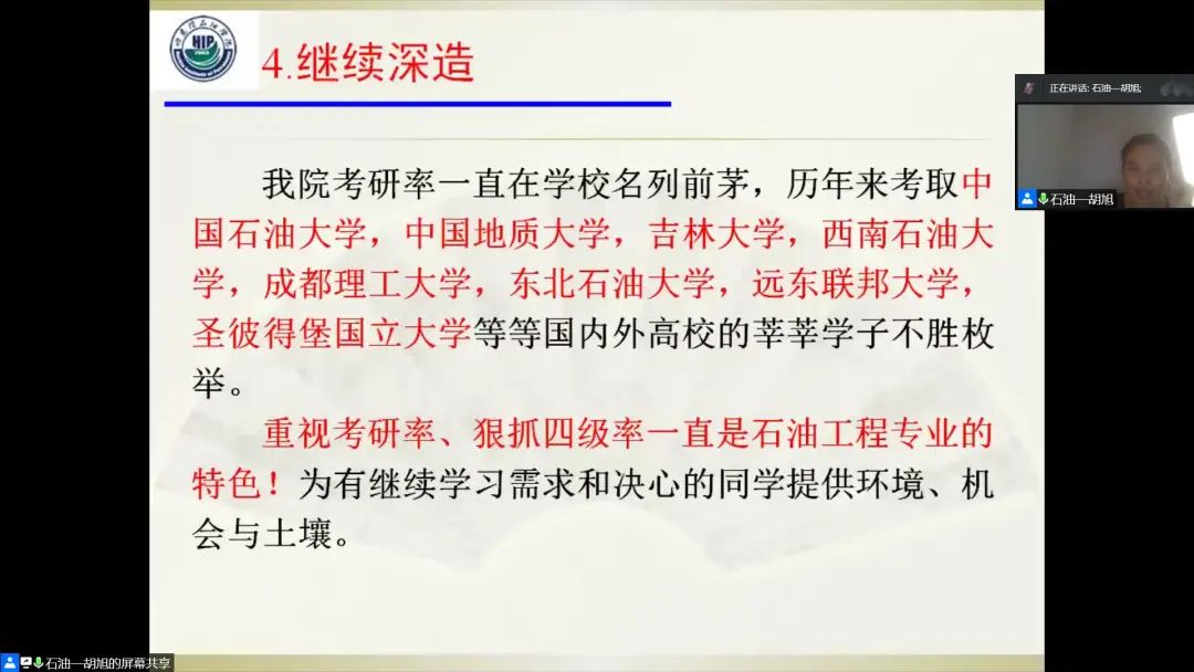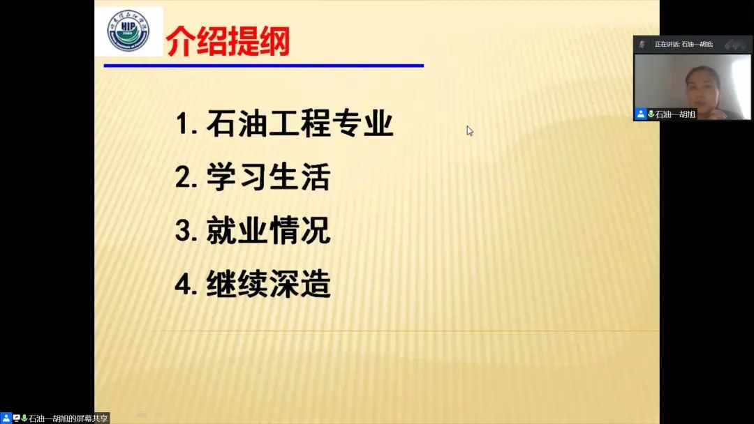 随后,胡旭老师从专业的角度,通过生动形象的语言向同学们介绍了专业的发展、学习生活、就业情况、考研深造及学院师资力量等多方面内容,让每一位同学从不同角度对所在专业有了基本的认识与了解。同时,胡旭老师介绍了往届石油工程专业的优秀学子,分享了自己在石油专业上的经验与心得,并对同学们提出的问题进行了解答。并对同学们提出几点建议:一、掌握正确的学习方法,高效学习。二、要求真务实,不要好高骛远。三、多问多学,学院老师一定会竭尽所能为大家解决问题。最后,她也代表石油工程专业全体教师祝愿同学们的大学生活充实愉快。