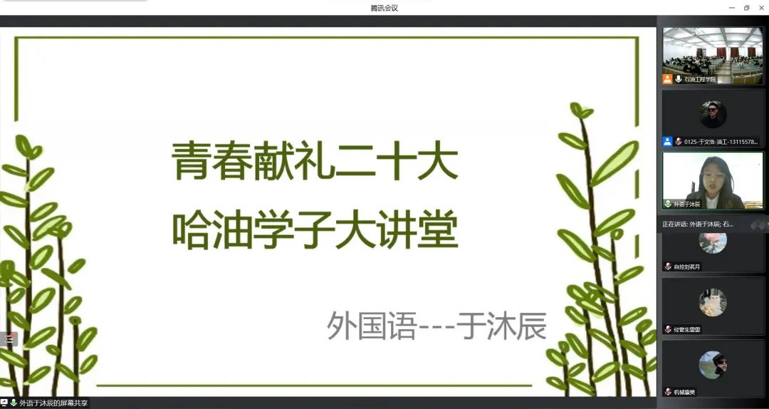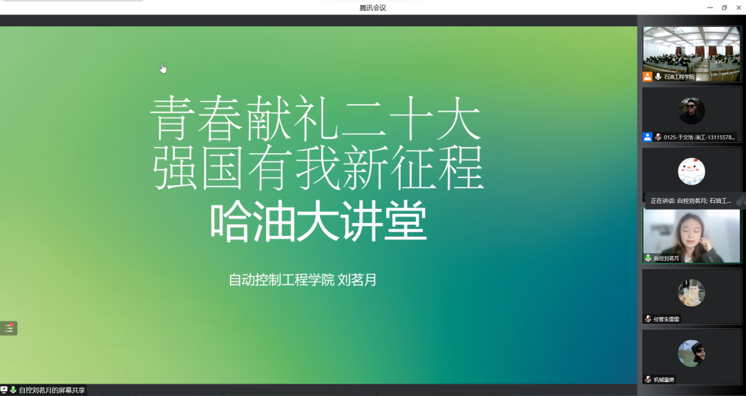 为进一步提升学生思想政治教育,提高学生对于国家和社会的认知程度,提升金沙官网学生的综合能力,10月25日,我院开展哈油学子大讲堂线上宣讲活动。我院党总支书记刘雁春、2022级辅导员尹航出席本次活动。