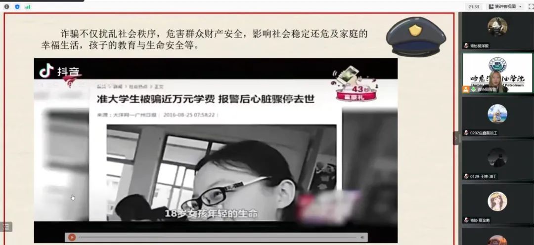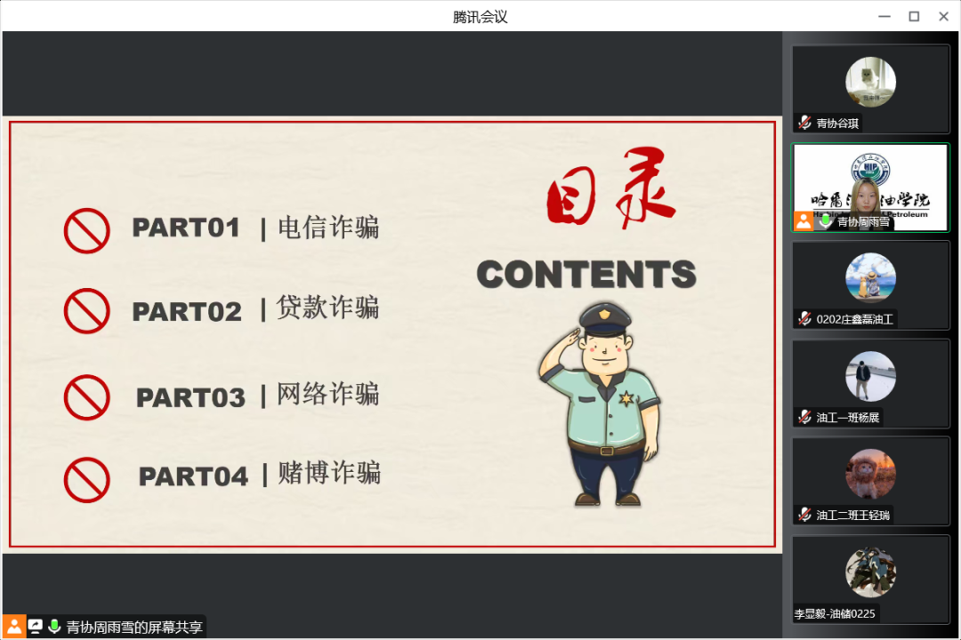 为进一步增强在校同学的法治观念,提高反诈防骗自我保护意识和能力,强化打击治理电信网络诈骗防范工作,有效遏制诈骗案件发生。我院于11月3日在腾讯会议(776-166-4974)开展以“紧绷防范之弦 远离诈骗之害”为主题的宣讲活动,本次活动由我院青年志愿者协会主办,党总支书记刘雁春、党总支副书记&学团办公室主任张雪老师出席此次活动,22级全体同学及20级、21级部分同学参加。