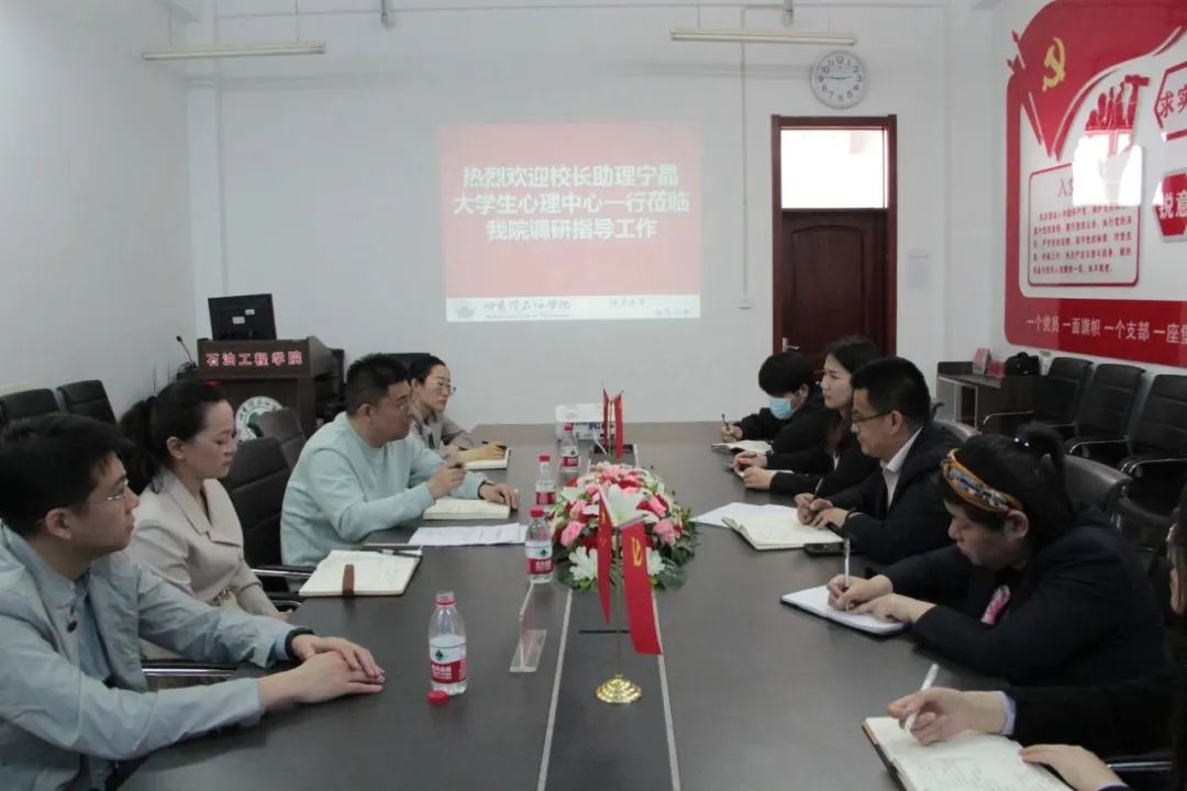 最后,校领导还对石油工程学院今后的工作提出希望,希望全体老师要有强烈的责任心和敏感度,加强对心理工作的重视,要将其当做是事关稳定的工作来做,同时在工作中要有三个心,细心、耐心、恒心,工作做细做实、不厌其烦,对每一个学生认真负责,做好后续跟踪服务,为学生的成长保驾护航。通过本次心理工作调研交流,搭建了学校与学院间交流学习的平台,实现优势互补、资源共享,加强校院联动,为我院心理健康教育工作提供了新思路、新方法,对共同促进学生心理健康工作发展有着重大意义,让同学们保持一个身心健康的状态,更好地完成学业和成长成才,进一步推动我院心理健康教育工作取得新成效。