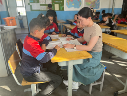 7月24日中午,志愿者高原等一行四人来到新疆维吾尔自治区阿克苏市依干其中心小学为小学生讲解普通话,并由老师带领同学们了解民族区域自治制度,学习民族团结的深刻内涵,同学们也通过学习书本小故事来初步练习用普通话发音。