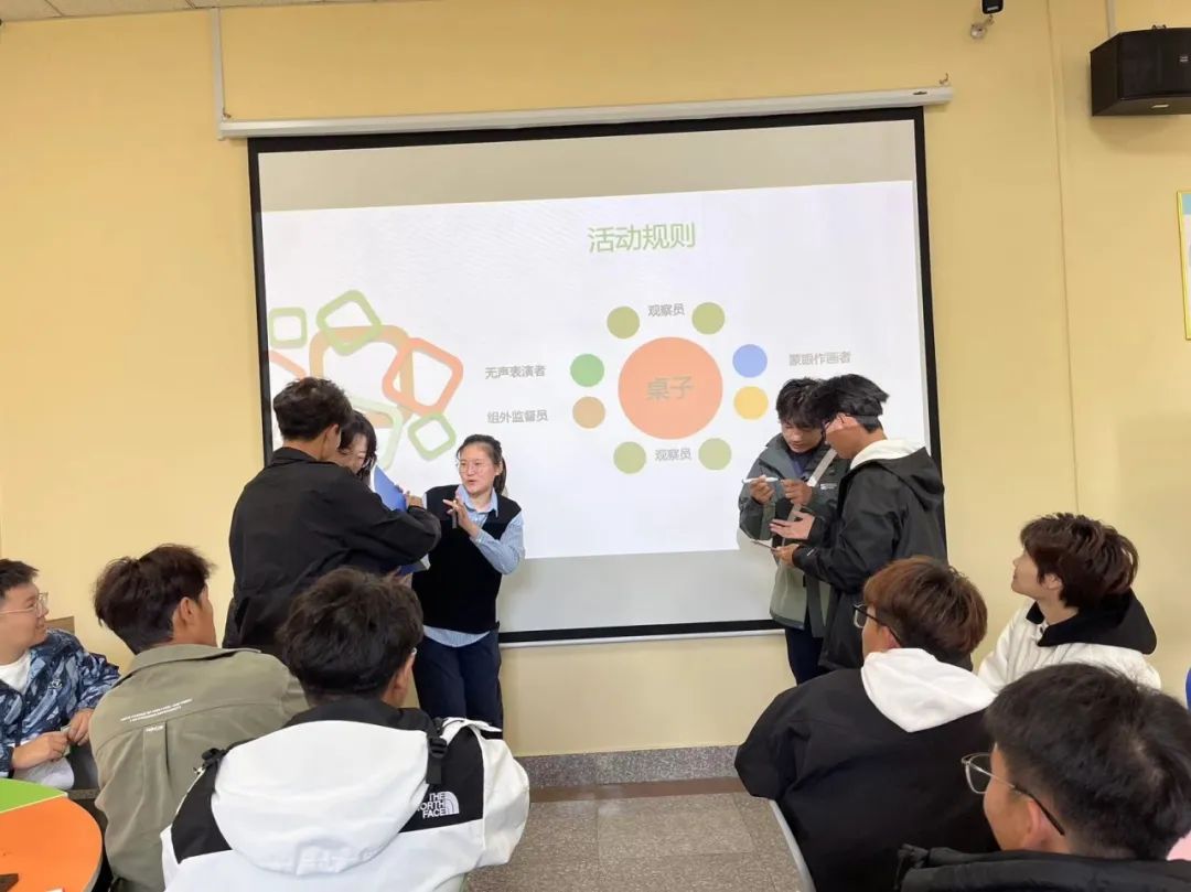 之后,为了让同学们更加代入及直视自己的真实心理,叶老师带领同学们进行“盲说盲画”游戏环节,同学们分为各个小组,每组选出蒙眼画图、用肢体语言传达图片中图画形状、向蒙眼同学传达肢体语言内容三人进行游戏,此游戏通过反映每个人心里的差异的过程,以及说者无心,听者有意的现象,使大家对自己和他人的主观意识有了更深层次的思考。