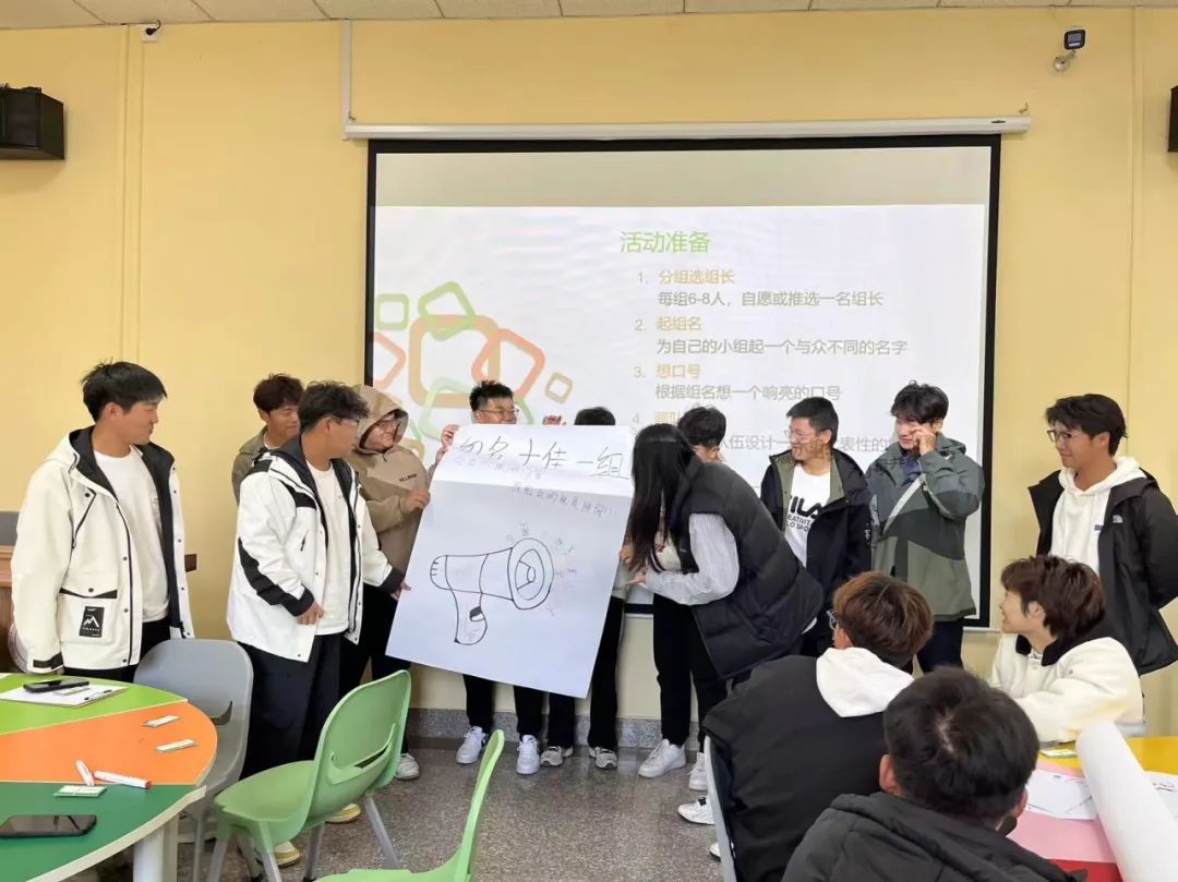 活动上,叶老师针对当代大学生的心理特点以及易出现的心理问题,结合当下热点话题,用幽默诙谐的语言,带领同学们进行了一次探索自己内心世界的旅行。首先,叶老师让大家自行组队,通过讨论设计队名及队徽,选派一名同学对队名和队徽的设计理念进行阐述,培养学生们的集体意识。