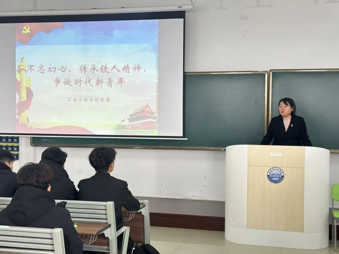 第三节培训,由党总支副书记张雪进行《不忘初心,传承铁人精神,争做时代青年》进行授课,她首先回顾了铁人王进喜为祖国石油事业奉献的峥嵘岁月,讲述了王进喜“为国分忧、为民族争气”的爱国主义精神,最后她强调,要认真感悟铁人王进喜的丰功伟绩和精神风范,坚定理想信念,传承赓续红色血脉,立足自己岗位,恪尽职守,攻坚克难,以实际行动将铁人精神贯穿工作始终,助力学院进一步发展。