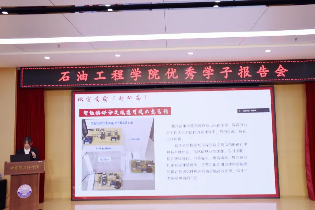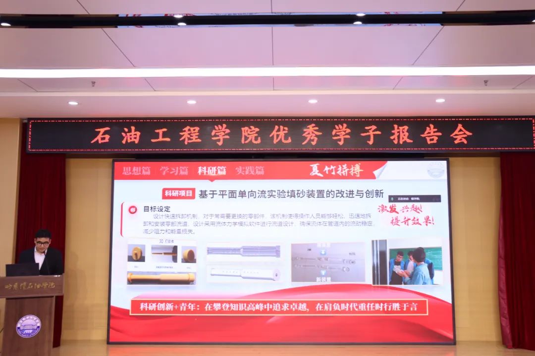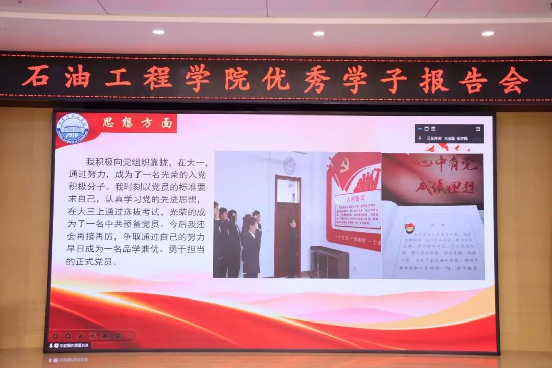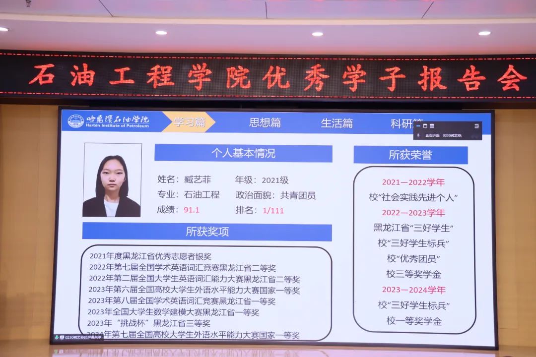 报告会邀请了身边的青春榜样:石油工程学院22级杨展,21级臧艺菲、朱宝磊、赵玉玲,23级辛悦五位优秀学子分享他们的成长故事和学习经验。国家奖学金获得者杨展、臧艺菲、朱宝磊、赵玉玲分享了自身在专业学习、科研创新、社会实践、志愿服务等方面的“战果”与“利刃”讲述了自己奋勇拼搏、矢志追梦的故事以及在哈油成长的体验和感悟。国家励志奖学金获得者辛悦表示,大学的核心应当是“学”,刚进入大一的新同学,要养成良好的学习习惯,打好基础、学好课程,鼓励大家要有耐心与毅力,坚定信念。勇往直前。国家奖学金获得者杨展建议学生干部们要守“初心”、用“诚心”、展“雄心”、怀“戒心”。分享了班级建设的一些方法、体会以及参与学科jij竞赛的经历,他认为在大学阶段参与学科竞赛是可以尝试的充满知识与挑战的新道路,有艰辛,但更多的是成长和收获。