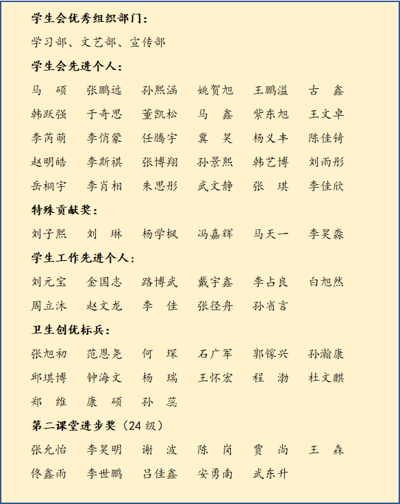 本次表彰大会设立了“学生会优秀组织部门”、“学生会先进个人”、“特殊贡献奖”、“学生工作先进个人”、卫生创优标兵”、“第二课堂进步奖”等多个奖项。