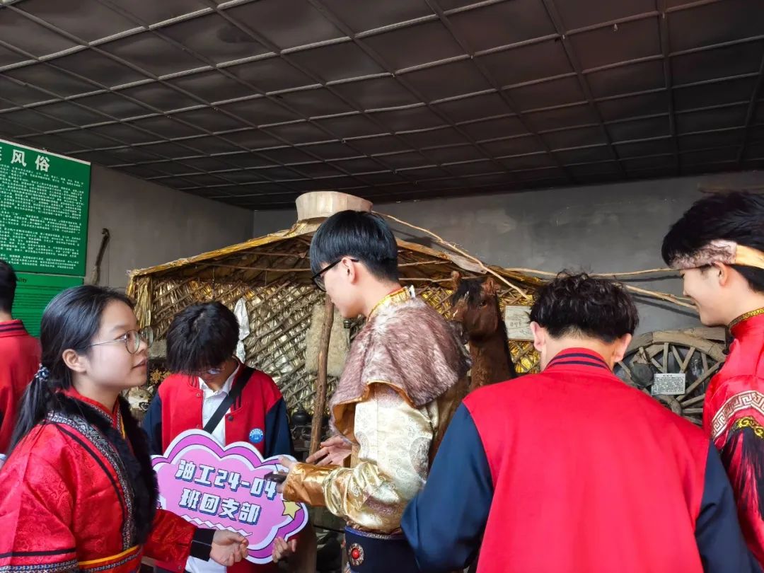 师生们通过参观主馆区的12个少数民族家庭展览,了解了不同民族的文化和习俗。当面对赫哲族鱼皮衣时,带队教师张国芳现场教学:“解读岩层纹路是石油人的基本功,但今天同学们从鱼皮衣的纹路里读懂了可持续发展的古老智慧,这才是真正的文化育人。”参观结束后同学们穿着各民族的服装进行了互动体验,深切感受到了民族文化的魅力和多样性。