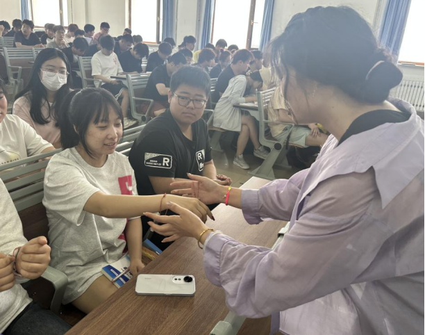活动现场洋溢着温馨祥和的节日氛围。各年级辅导员走到同学们中间,亲手将寓意着健康、平安与吉祥的端午红绳,一一系在学生们的手腕上。一条条鲜艳的红绳,承载着学院对学子们深切的关怀与美好的节日祝愿。辅导员们亲切地与同学们交流,询问学习生活近况,勉励大家传承石油精神、铁人精神,不断砥砺前行。这份“亲手系上”的仪式感,让小小的红绳变得格外珍贵,拉近了师生距离,也让“薪火相传”的寓意更加生动可感,同学们的脸上洋溢着幸福的笑容。