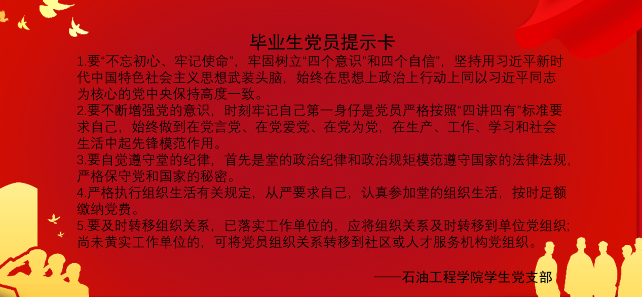 为全面加强从严治党,增强我院毕业生党员身份意识,引导毕业生党员发挥好示范性作用,切实抓好毕业生党员的党性教育,石油工程学院学生党支部于2023年6月1日在主教703B党员之家开展了毕业生党员“一卡一课三重温”主题教育活动,我院2023届全体毕业生党员参加,该活动由石油工程学院学生党支部书记王娜主持。