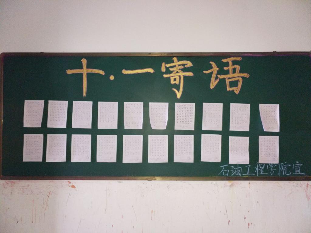 石油工程学院的同学们把自己想对祖国母亲,对培养我们的学校以及对陪伴我们的同窗好友想说的话,以钢楷的形式书写出来并上交。我院在短短的几天中共征集了数十件作品,我院经过评选挑选出20篇优秀作品并展出。