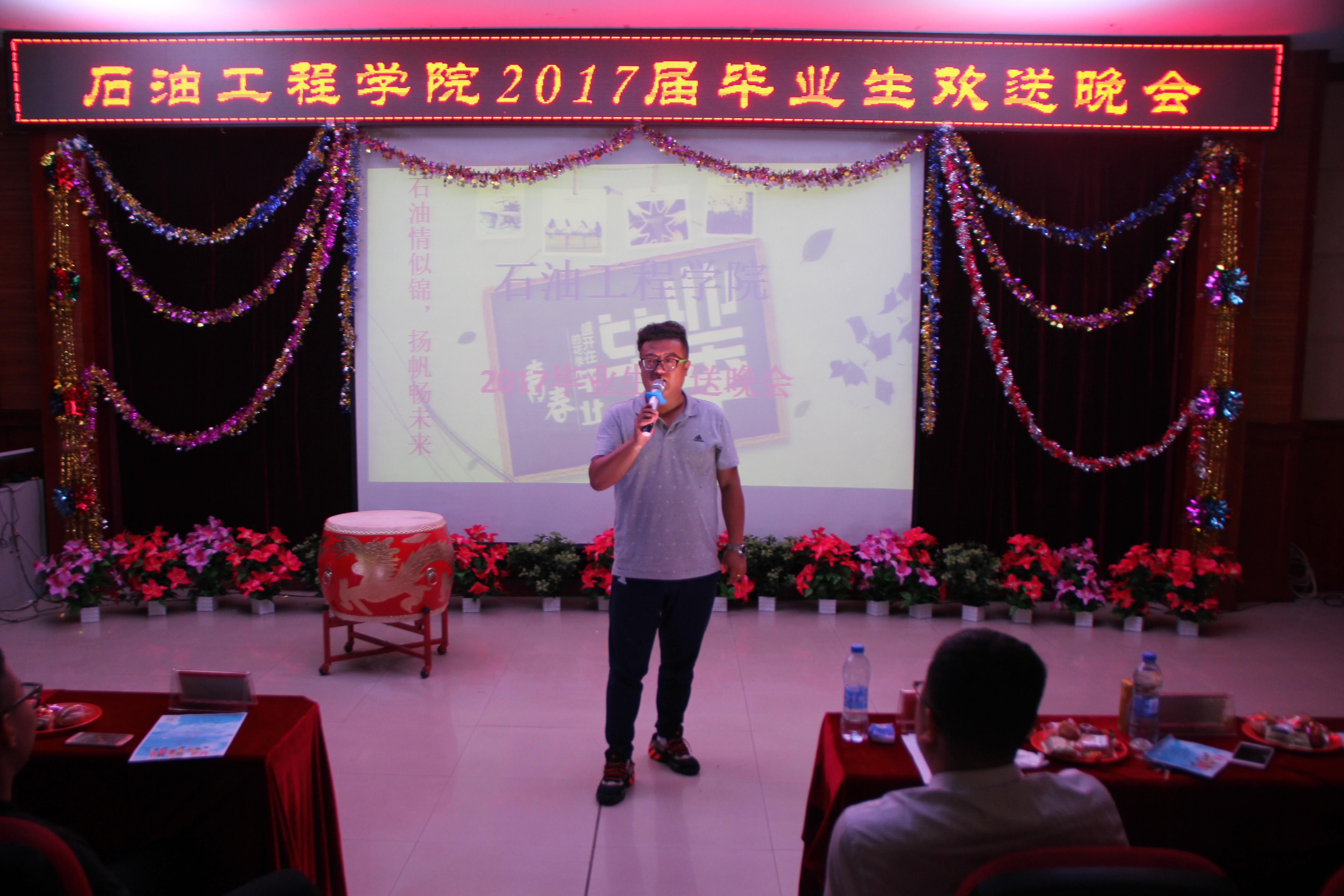 六月盛夏,又是一年毕业之际,为表达我院对即将毕业的学子们的关怀,留下美好的大学回忆。6月14日下午5点30分,石油工程学院在主教518教室举办了“石油情似锦,扬帆畅未来”2017届毕业生欢送会。校学工处副处长、校团委书记王锦石、校团委副书记彭雷、校网络中心主任毛雷、石油工程学院党总支副书记康平军、团总支书记张雪、13级学生辅导员王昱,15级学生辅导员于洪峰以及石油工程学院全体2017届毕业生参加了这本次晚会。