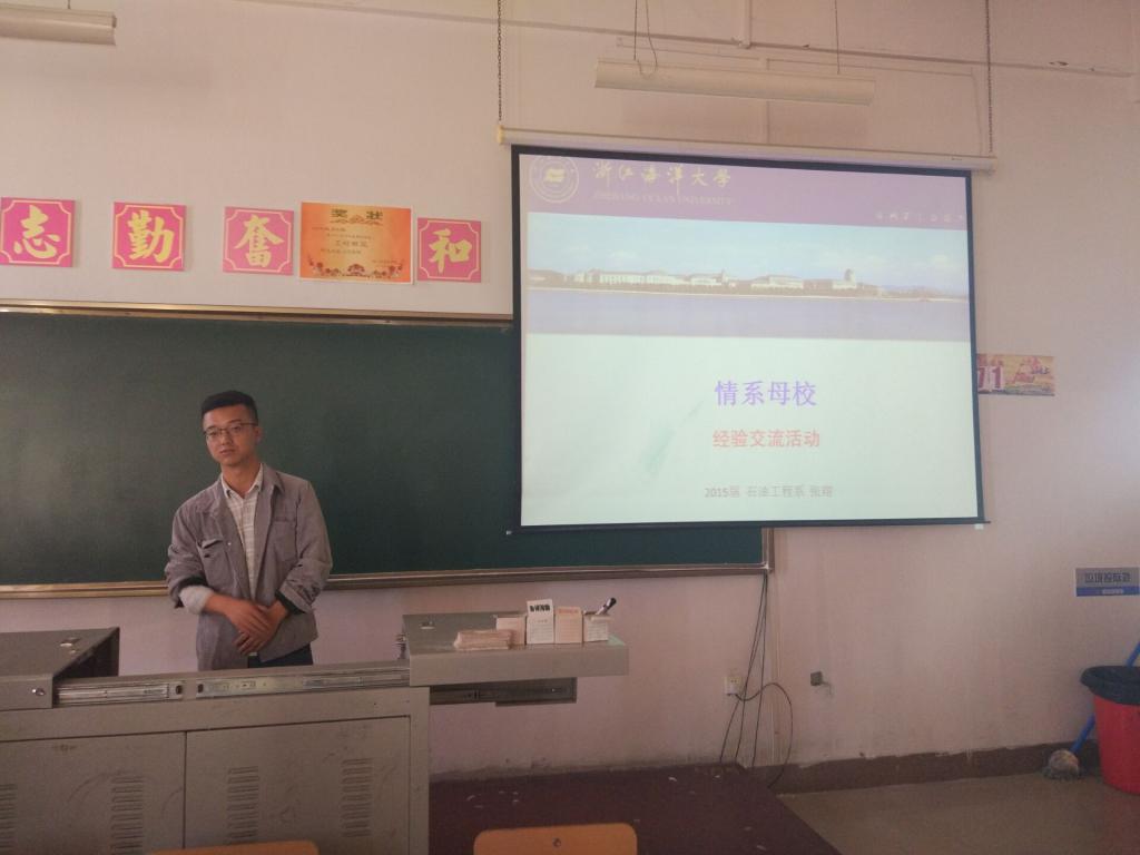 张翔,男,石油工程学院2015届毕业生,现就读于浙江海洋大学,研究生三年级。张翔同学心系母校,不忘师恩,于9月25日回到母校看望曾经教过自己的老师,为学弟学妹分享自己的读研经验和心得体会。