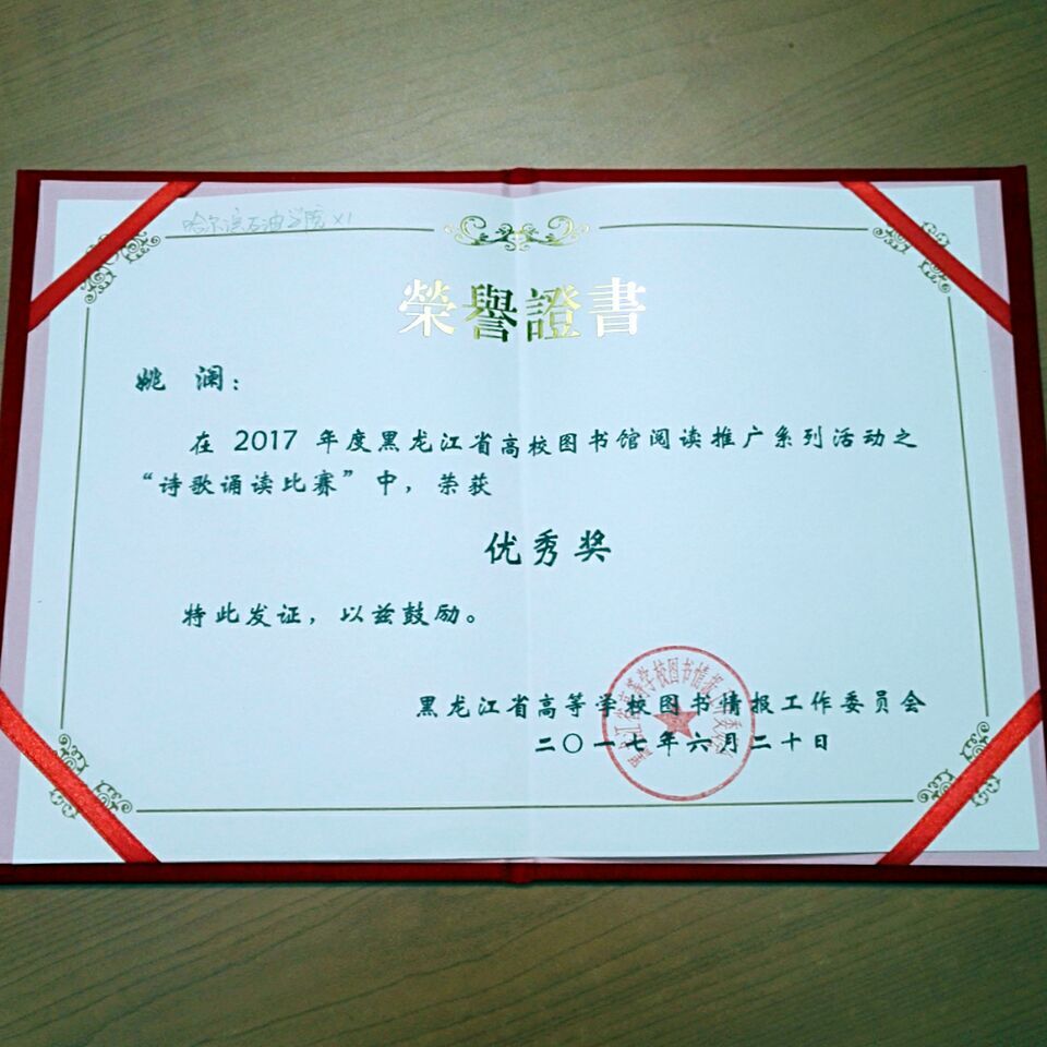由黑龙江省高校图工委主办的,各高校图书馆承办的黑龙江省高校诗歌诵读比赛圆满落下帷幕,金沙官网土木工程学院姚澜同学的作品荣获优秀奖,6月21日,图书馆于红副馆长为姚澜同学颁发了奖状和奖品,并希望金沙官网优秀学子越来越多的参与到这样的大型活动中,在比赛中展现风采,取得佳绩。