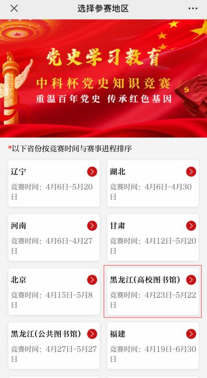 为激励和促进广大师生学史明理、学史增信、学史崇德、学史力行,把“学党史”和“悟思想”贯通起来,结合中国共产党的百年奋斗历程,深刻领会把握习近平新时代中国特色社会主义思想的精神实质、核心要义、理论品格,不断提高学习贯彻自觉性坚定性,黑龙江省高等学校图书情报工作委员会现面向黑龙江省高校全体在校师生举办黑龙江省中科杯“重温百年党史 传承红色基因”党史知识竞赛以及党史学习教育主题系列活动。