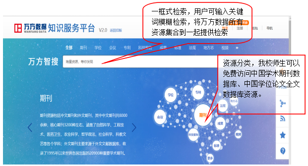 万方数据知识服务平台是由万方数据股份有限公司推出的大型文献信息资源服务平台,是国内最大、最齐全、最权威的中文数据库服务平台之一。该平台收录了包括期刊、学位、会议、标准、专利、成果、图书、法规、方志、机构、专家、学者等十几类高品质主题文献,上百个数据库,拥有上亿条数据文献,并融合了知识脉络分析、查新/跨库检索、引用通知、投稿服务、专题服务等文献深度挖掘服务,形成了能够提供中外文文献阅读、全文检索、在线浏览、原文传递、主题分析在内的全方位一体化的超大型综合文献知识服务系统。