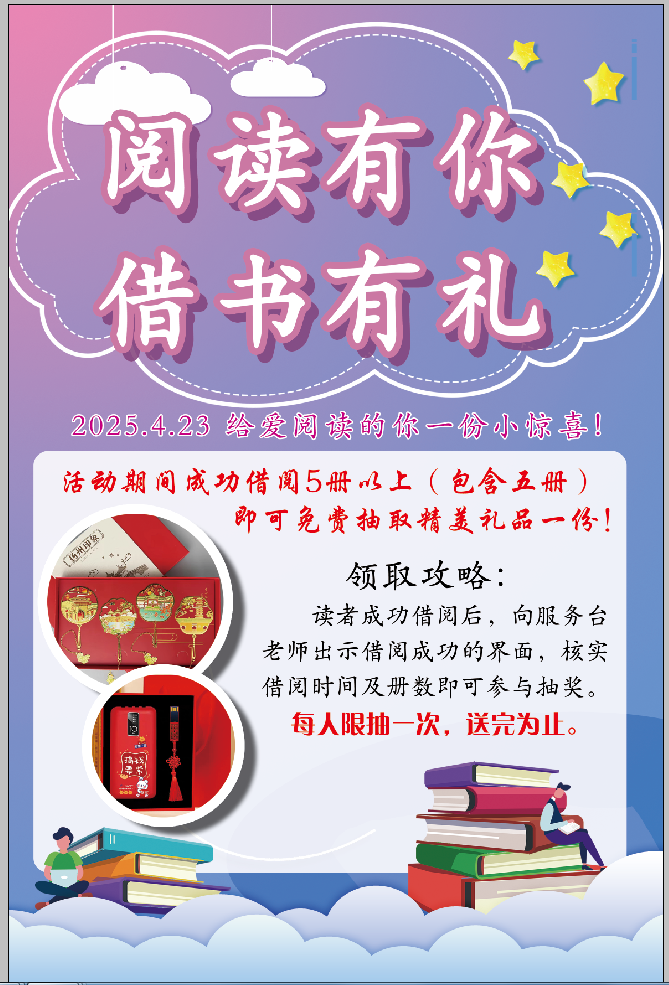 凡4月23日“世界读书日”当天,到图书馆服务台借阅五本以上图书的读者,均可抽取精美礼品一份。(一个借阅号只能抽取一次,先到先得,送完为止)。