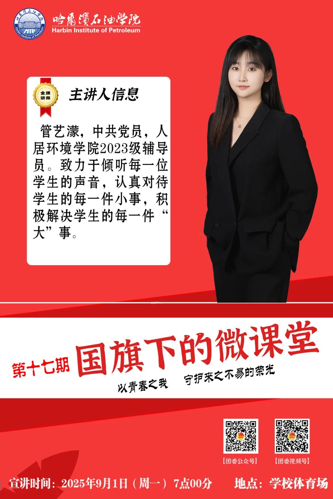 第十七期“国旗下的微课堂”主讲人为人居环境学院2023级辅导员管艺濛,此次微课堂主题为“以青春之我 守护来之不易的荣光”。