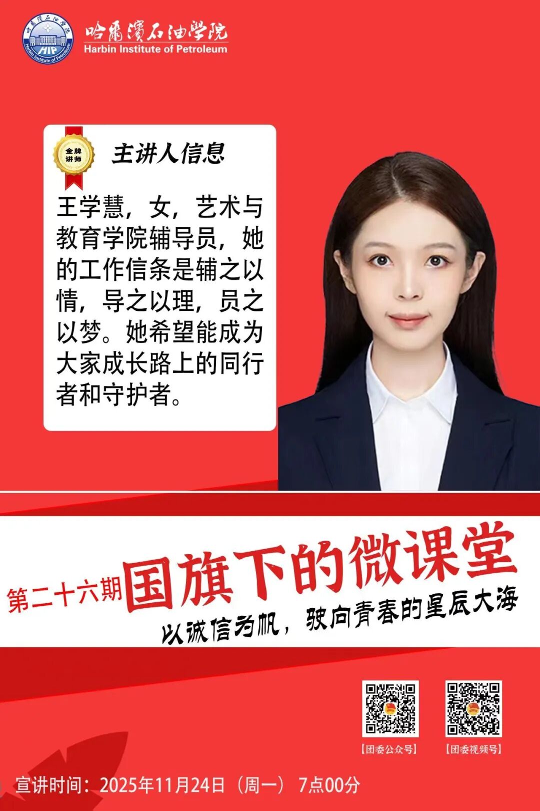 第二十六期“国旗下的微课堂”主讲人为艺术与教育学院辅导员王学慧,此次微课堂主题为“以诚信为帆,驶向青春的星辰大海”。