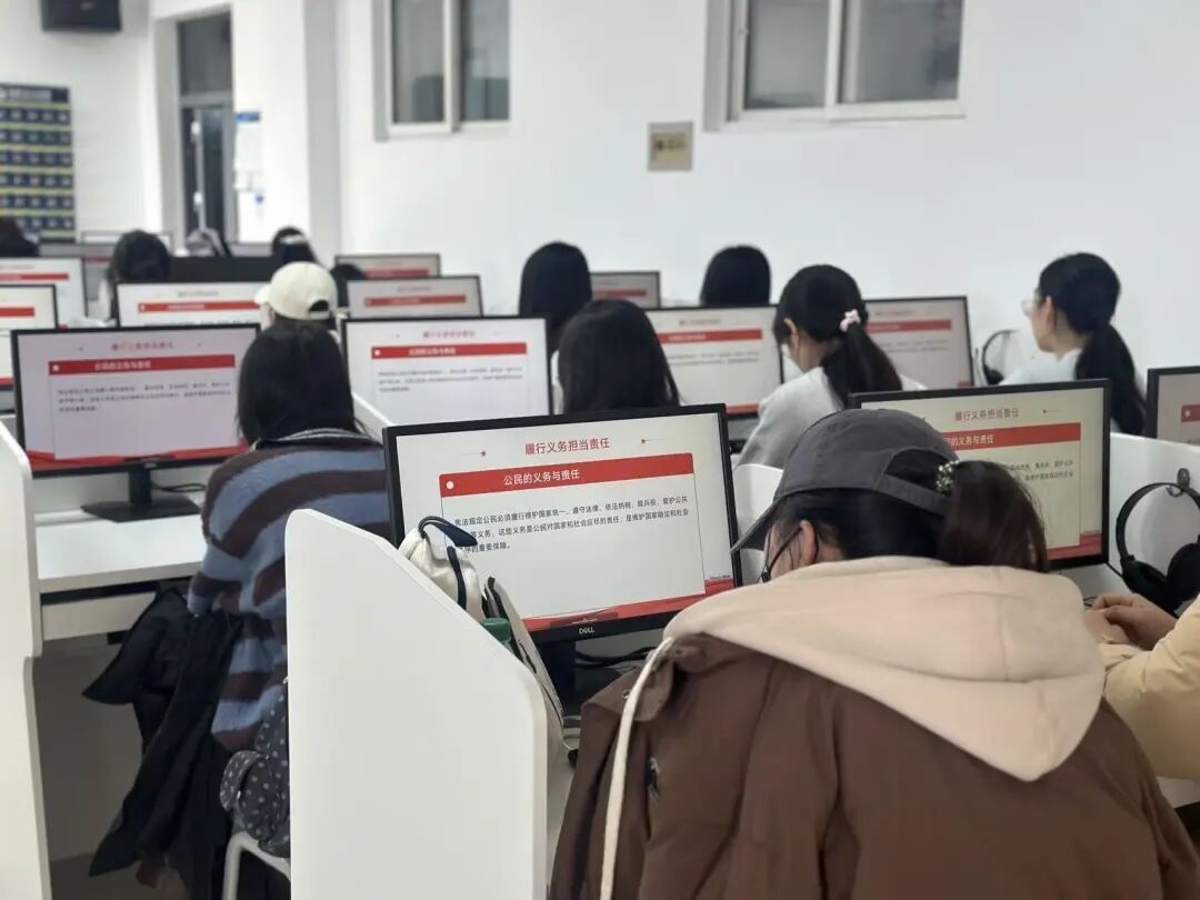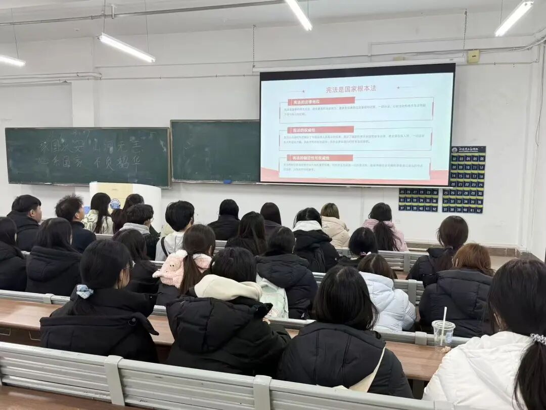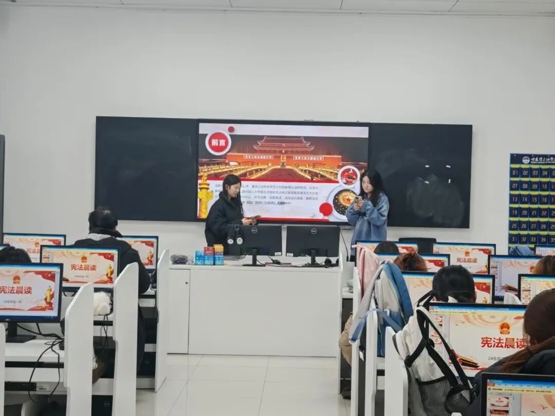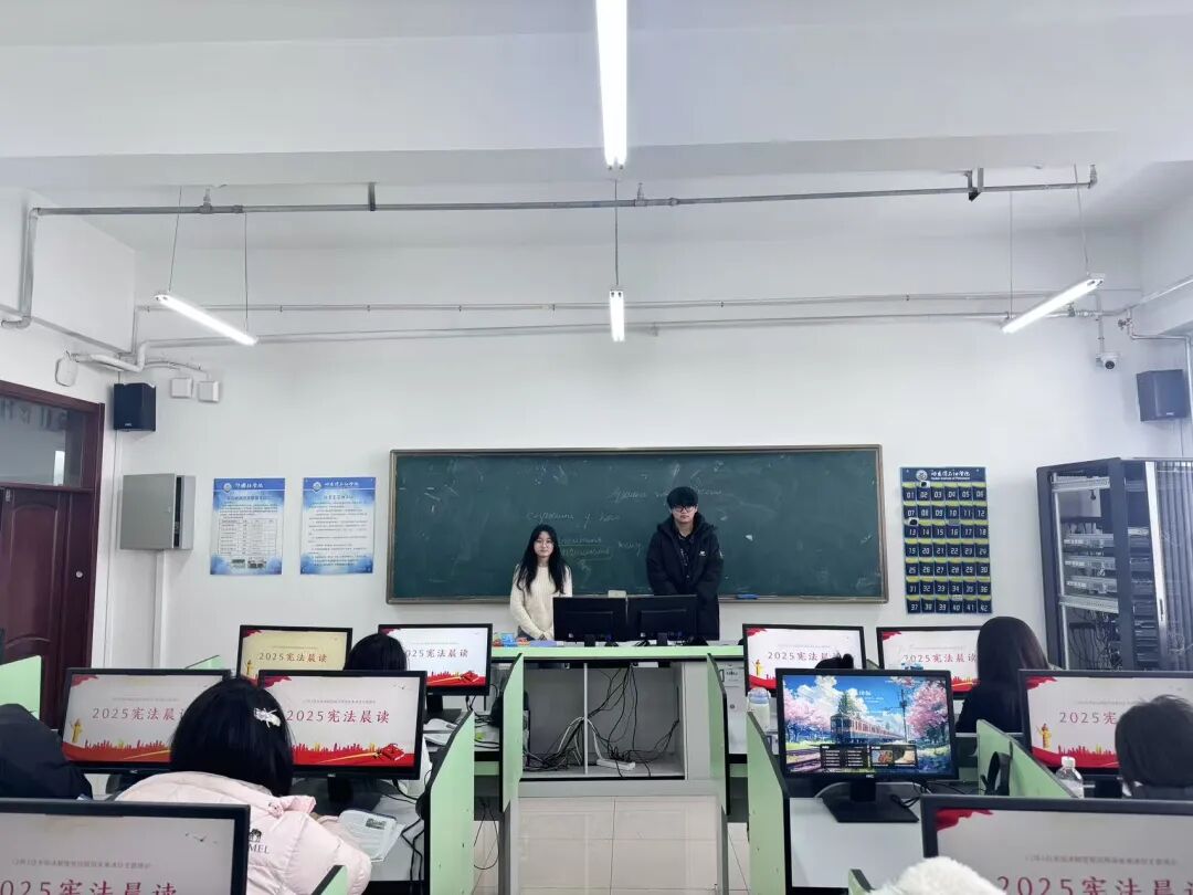 活动前期,院系辅导员提前部署安排,指导各班班委精心筹备。活动当天清晨,各班级教室秩序井然,同学们精神饱满,在班级干部的领读下,齐声诵读宪法核心条款。朗朗书声穿透教室,同学们逐字逐句认真研读,深刻感悟宪法作为国家根本大法的庄严性与权威性,在沉浸式诵读中强化“学法、懂法、守法、用法”的思想自觉。