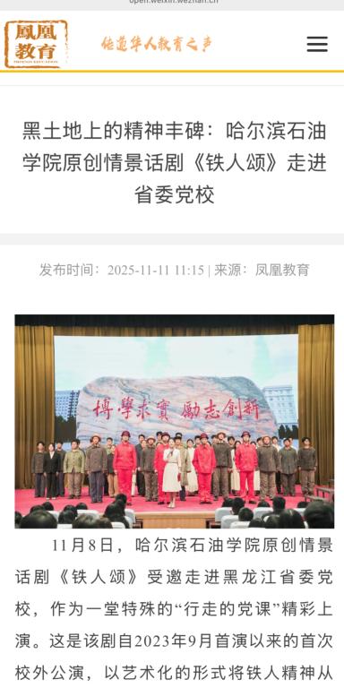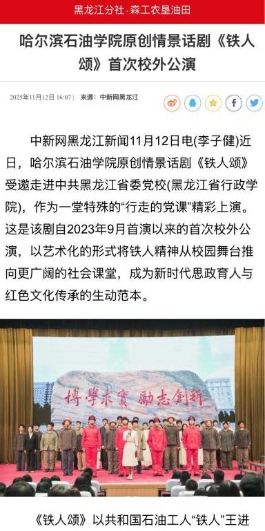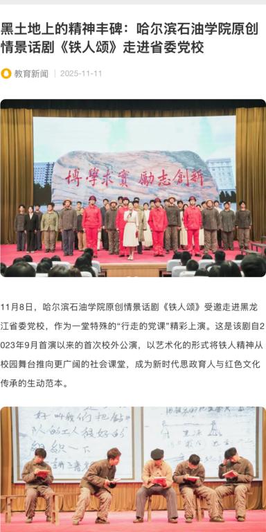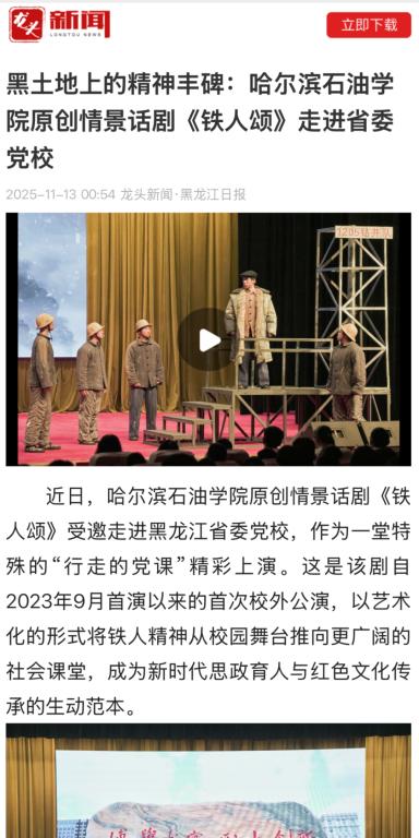 学校通过“展演—景观—叙事”三维文化场域,将铁人精神深度融入校园文化建设:铁人雕像广场、铁人精神育人馆与情景话剧《铁人颂》共同构建起沉浸式育人生态。此次省委党校演出,是学校推动铁人精神“走出校园、服务社会”的重要实践,通过艺术形式生动诠释了中国共产党人的精神谱系,为新时代传承红色基因提供了鲜活载体。