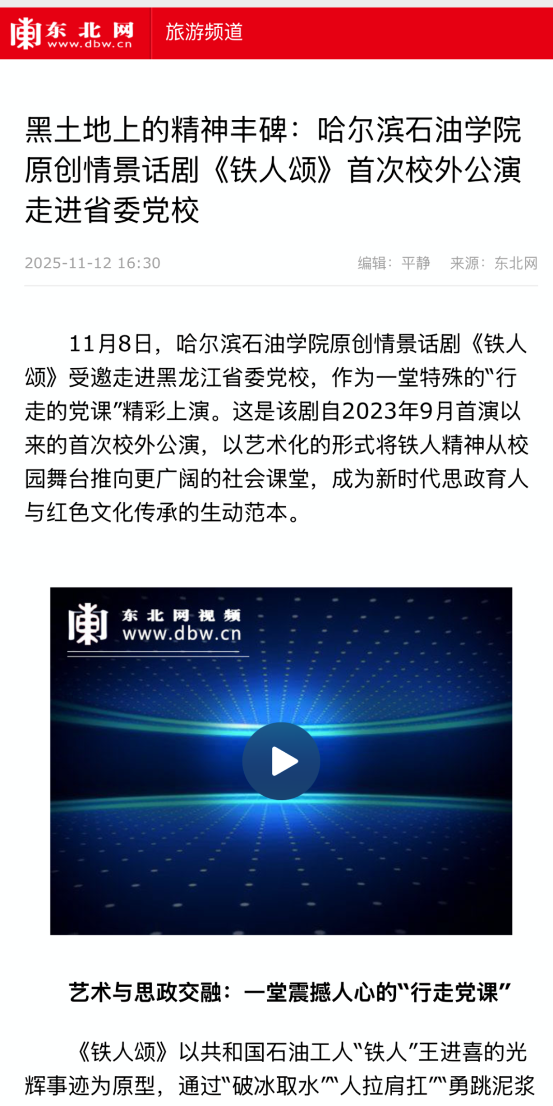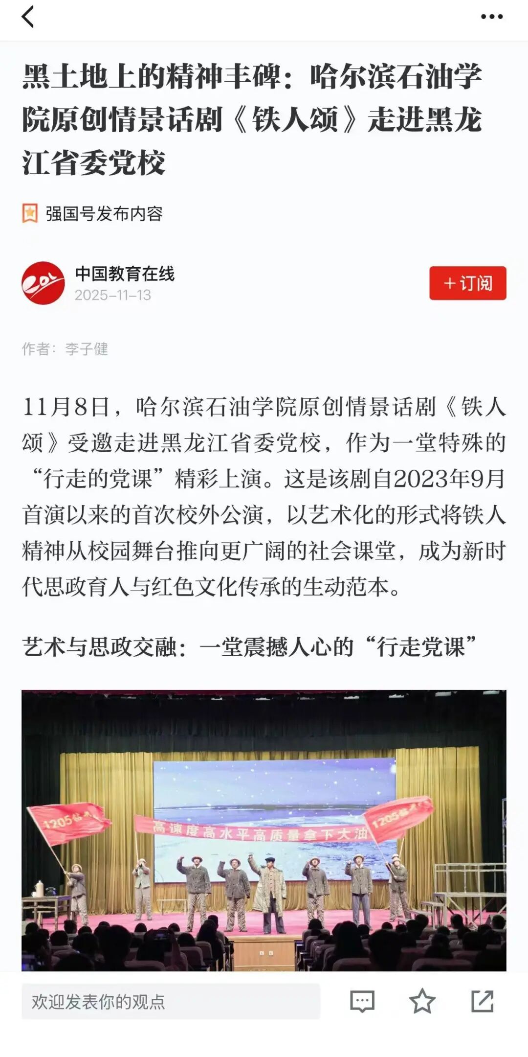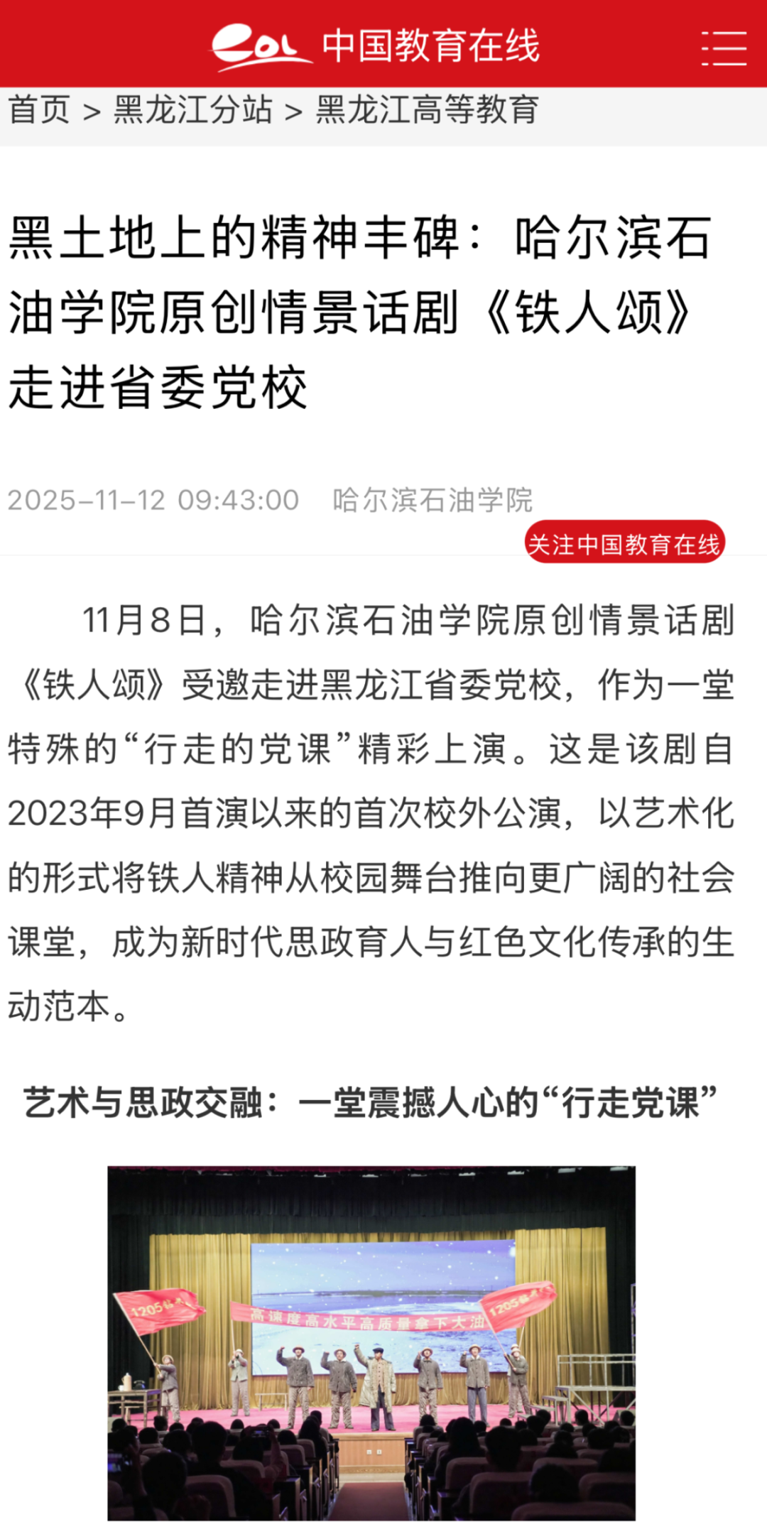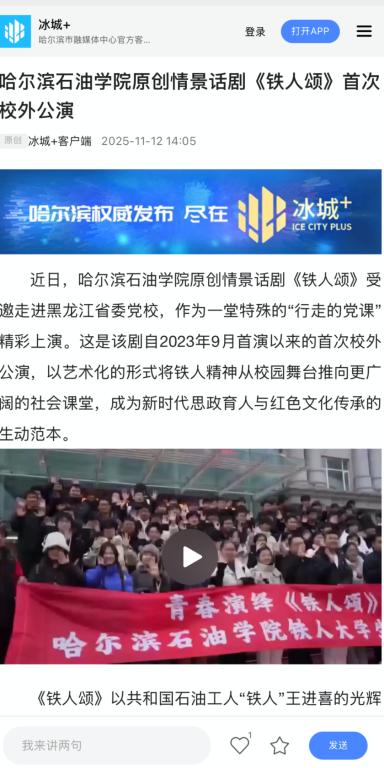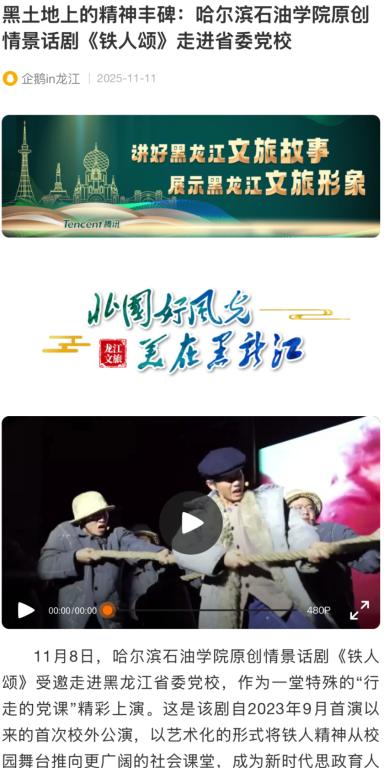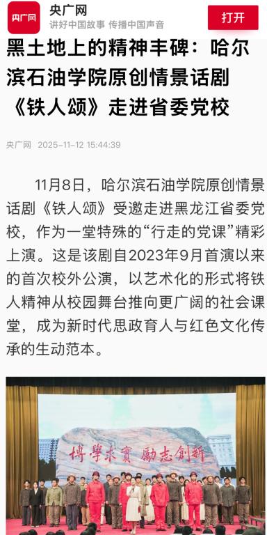 从校园舞台到省委党校,《铁人颂》以艺术之美点亮信仰之光,用青春话语激活红色基因。这部凝聚着黑土地精神力量的匠心之作,将继续以“行走的党课”形式,让铁人精神在新时代绽放更加璀璨的光芒,为培养担当民族复兴大任的时代新人注入不竭动力!