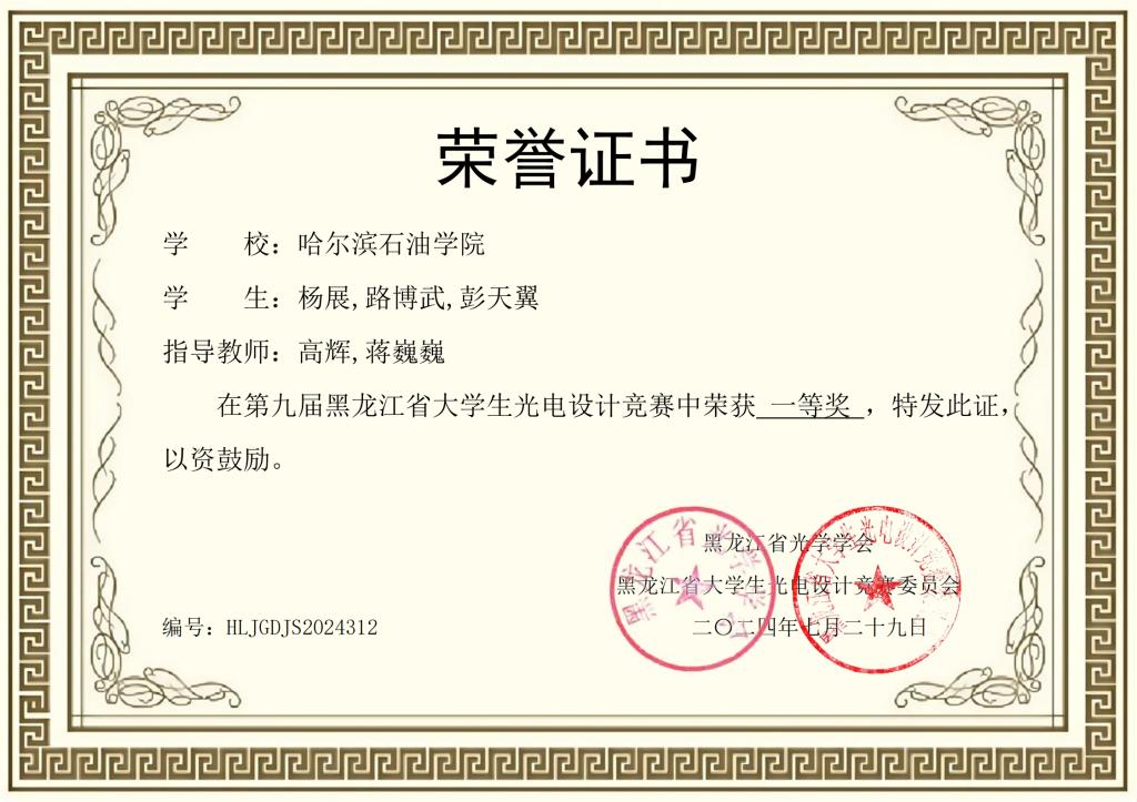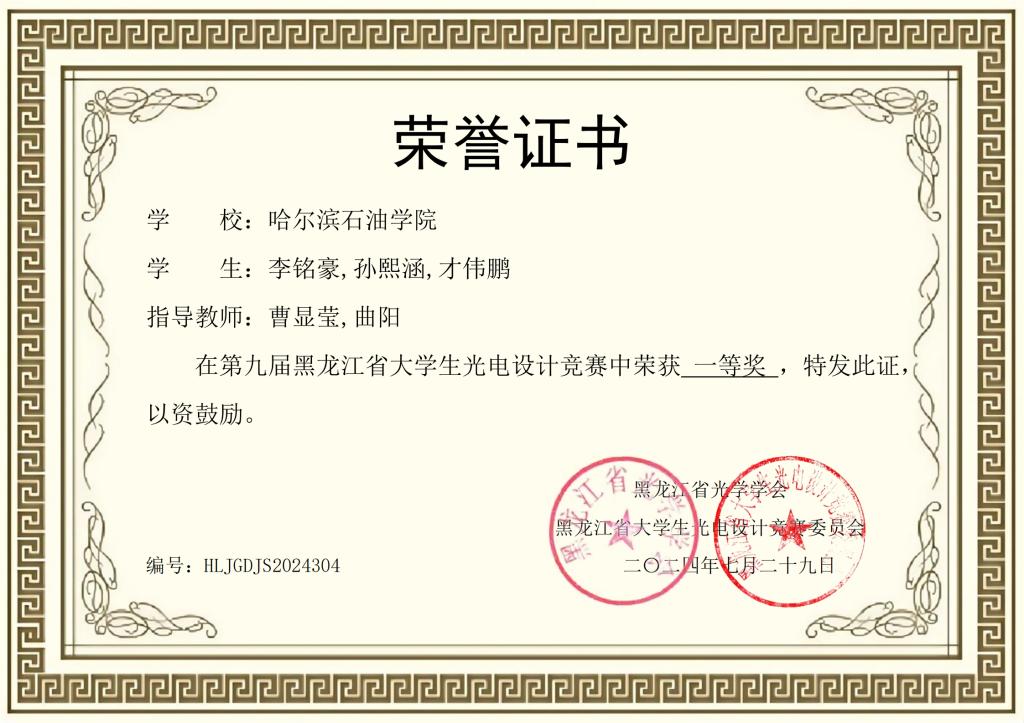 2024年第九届黑龙江省大学生光电设计竞赛中荣获一等奖名单
