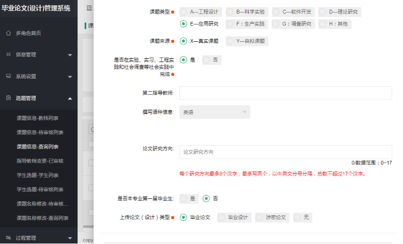 王院长对本届毕业论文选题逐条审核,从选题的专业性、实践性、创新性、目标明确性、范围的大小、字数等方面对每一个选题进行审核。将审核意见反馈给指导教师,最后经过反复确认后由学生提交论文平台进行系统审核。