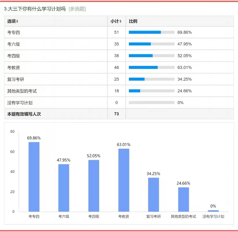 然后,王老师又给同学展示了一份问卷调查。这份问卷,由20级英语专业的大部分同学参与调查,真实地体现了学生们新学习的一些学习规划。通过这两份材料,同学们深受感触,纷纷表达自己新学期一定要发奋学习的主观愿望。