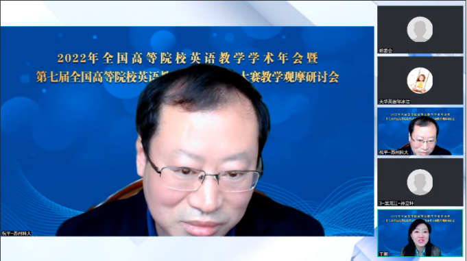 为了推动构建高质量高等教育体系,着力打造高校外语教学一流课程建设,促进优质课程资源广泛共享,搭建国内高校英语教师交流学习平台,回归以赛促学、以赛促教的出发点,高等学校大学外语教学研究会和全国高等师范院校外语教学与研究协作组于2023年3月18日至19日在腾讯会议线上召开2022年全国高等院校英语教学学术年会暨第七届全国高等院校英语教师教学基本功大赛。辽宁省高校外语教学研究会会长、中国翻译协会专家会员杨俊峰教授、中央民族大学外国语学院副院长、博士生导师石嵩教授等国内知名专家参会做了汇报,并对受邀进行教学分享的六位老师进行了点评。