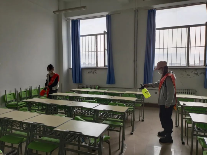 为积极响应疫情常态化防控要求,保障全体师生的健康,给同学们在校学习期间提供安全卫生的学习环境,并为线下复课做好充足的准备。外国语学院青年志愿者协会组织于2022年9月18日开展“健康校园,你我同行”教室消毒活动。