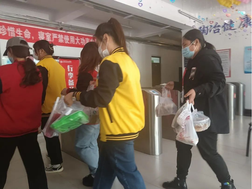 疫情当下,为避免人员交叉,保障学生们的日常饮食供应,保证在校师生的健康,严格落实校园管理措施,外国语学院统一组织志愿者送餐到各个楼层,再由党员老师送到学生的门前。在整个送餐过程中,志愿者们以认真负责的态度将隔离餐送至隔离区指定位置,分工明确,保障隔离中同学们的生活需求。不断地往返奔波,尽力将热乎的饭菜送到新生手中,全力保证新生的日常需要。