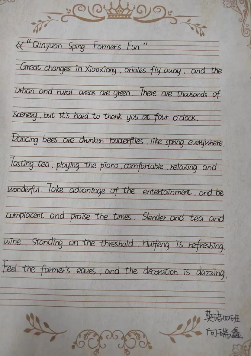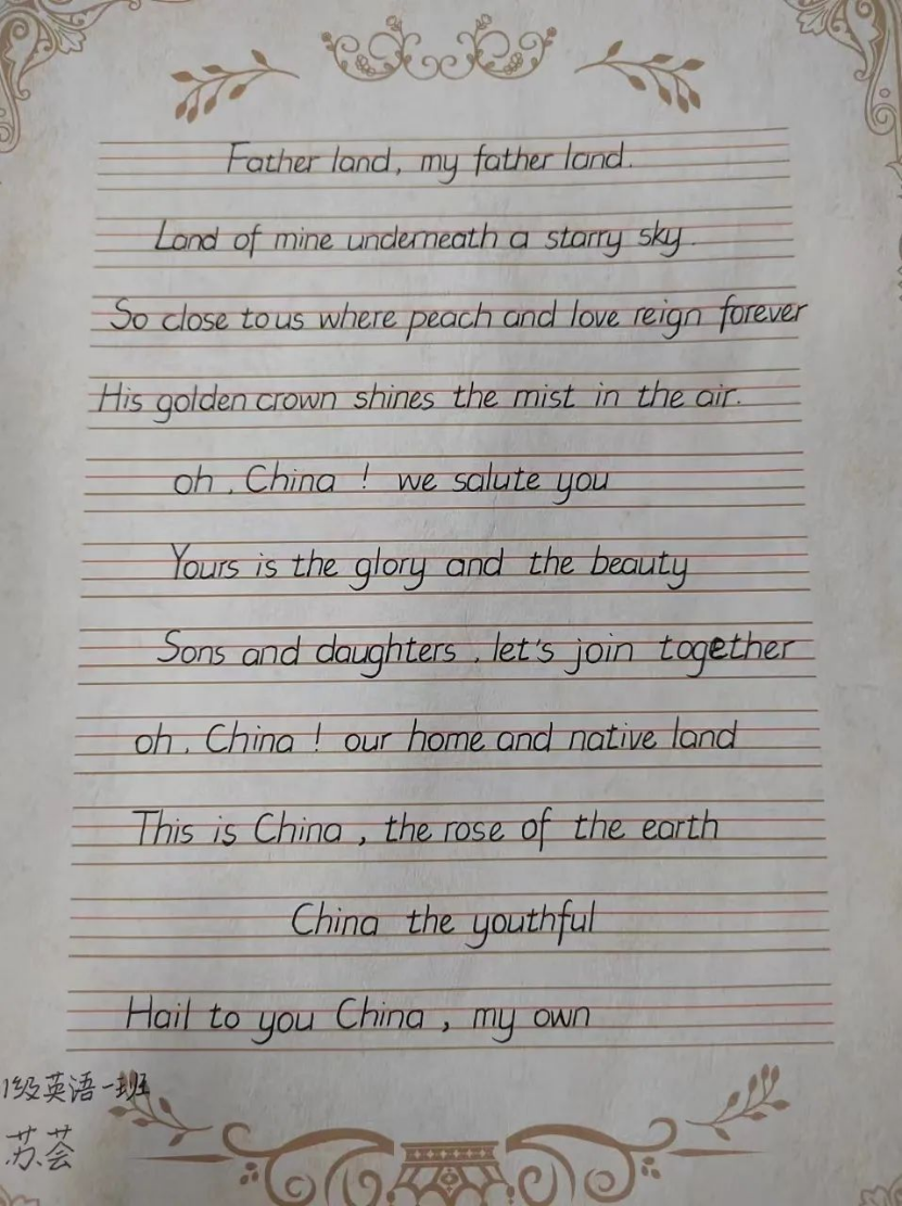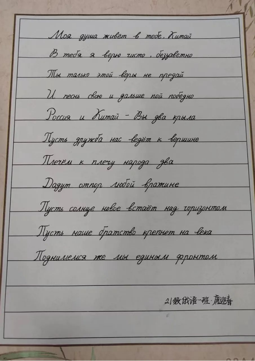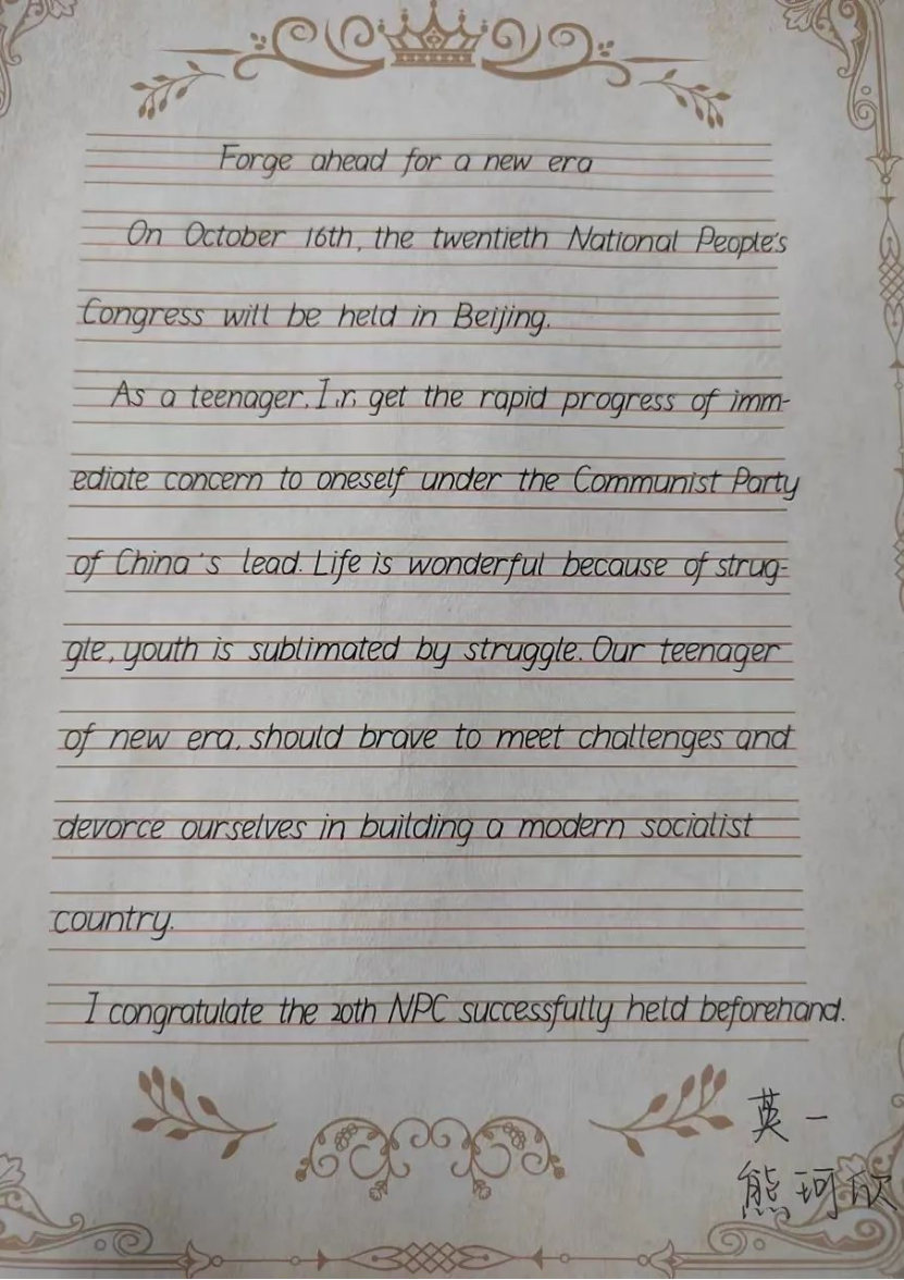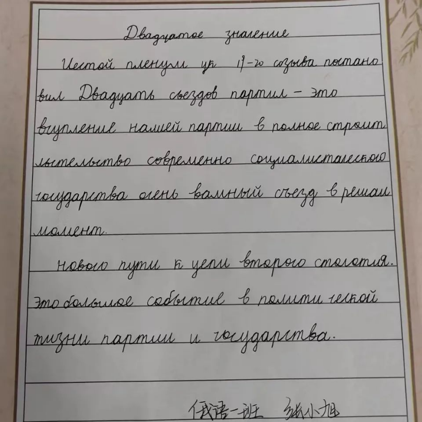本次书写大赛以“礼赞二十大 书写新篇章"为主题,将卷面整洁、书写字体的工整美观以及创意排版等作为评选的标准。作品整洁规范,内容围绕着家国情怀展开,笔画之间不仅体现扎实认真的书写功底,更展现同学们一丝不苟的书写态度。最终评选出英语优秀作品11篇,俄语优秀作品3篇,获奖作品于大厅展示。