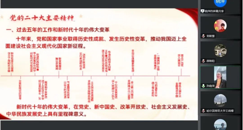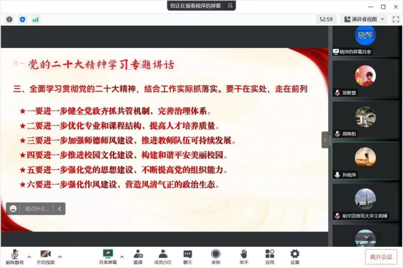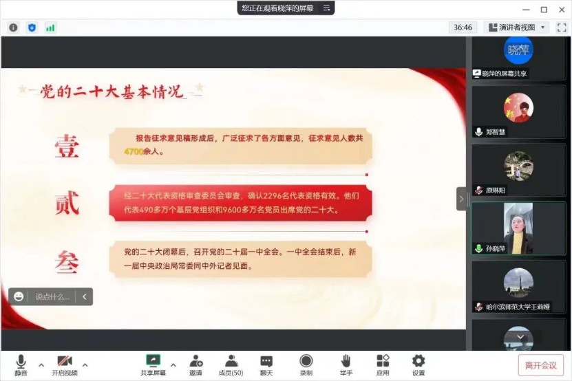 院长王莉娅在总结讲话中指出,党的二十大具有历史性的里程碑意义,标志着中华民族伟大复兴号巨轮开启崭新航程。大会作出的各项决策部署、取得的各项成果,必将对全面建成社会主义现代化强国、实现第二个百年奋斗目标、以中国式现代化全面推进中华民族伟大复兴发挥十分重要的指导和保证作用。我们要牢牢把握新时代新征程赋予教育事业的光荣使命任务,在本职工作中为党的二十大工作部署做出贡献,将每个人微小的力量会聚到一起形成磅礴伟力,在全面建设社会主义现代化国家、全面推进中华民族伟大复兴的新征程中书写更加优异的青春答卷。
