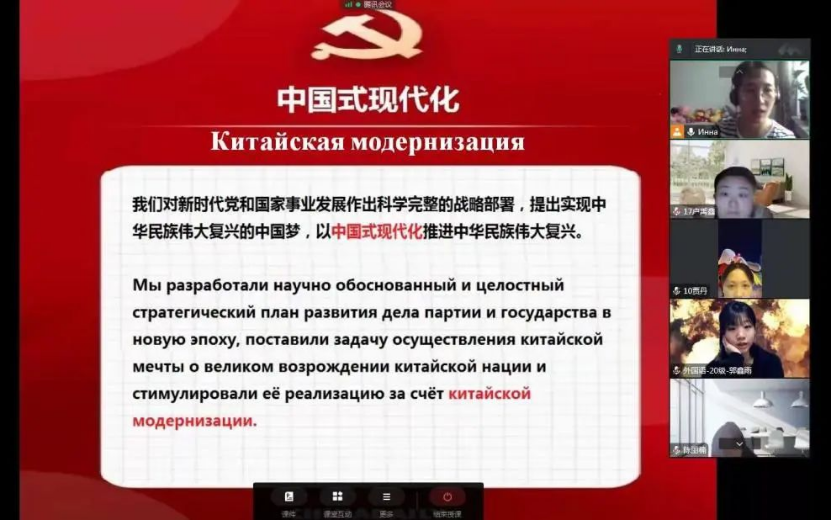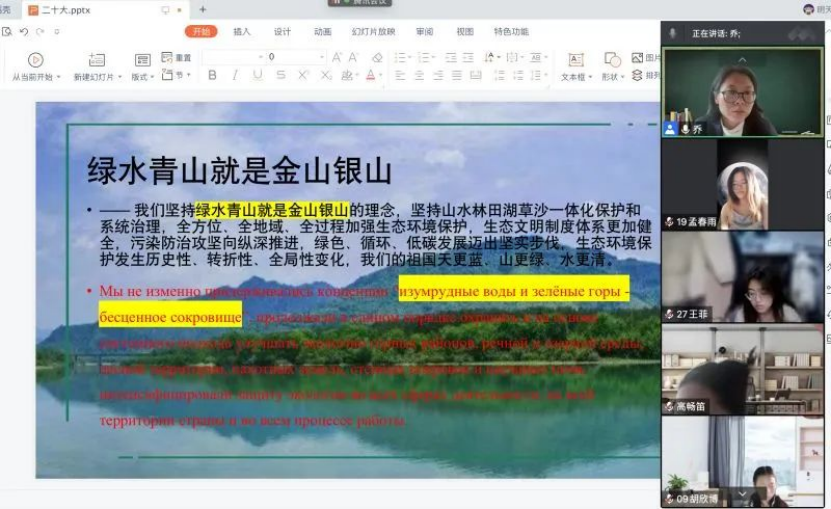 “中国式现代化”、“新发展理念”“人民立场”、“文化自信自强”……这些党的二十大报告中的热词用英语、俄语怎么讲?外国语学院教师发挥特长、立足岗位用实际行动讲好中国故事,传播好中国声音,展示好中国形象,增强文化自信,让中国共产党治国理政的理念传播更广推动中华文化更好走向世界。专业教师在教学设计中巧妙地将党的二十大报告双语金句热词作为教学内容,将最新理论成果运用到课堂教学当中,积极探索具有专业特色浸润式思政教育新模式,把思政课讲深、讲透、讲活。同学们纷纷表示,党的二十大报告金句热词双语权威准确表达对照探讨非常有兴趣、有意义,既学习了党的二十大精神,同时结合专业特点又提升了外语表达与翻译能力,课后还会持续探究学习。