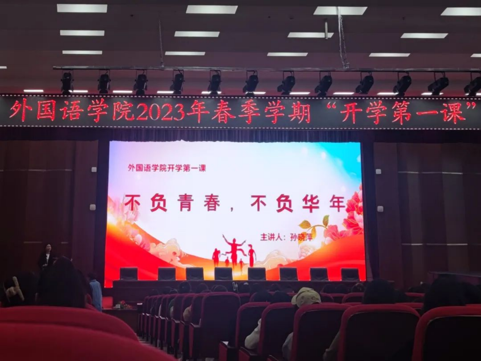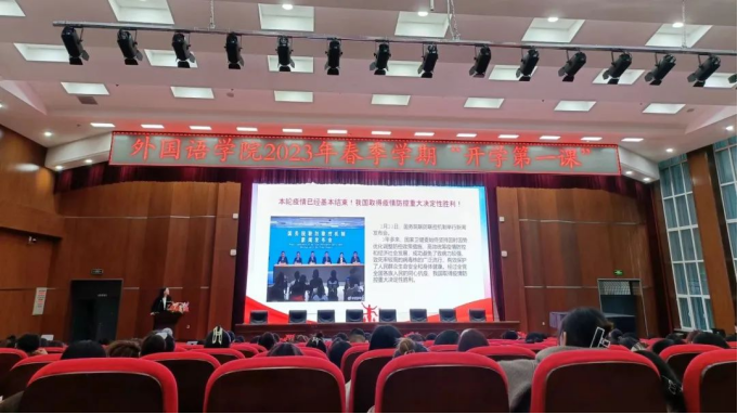 为深入贯彻党的二十大精神,喜迎新学期的到来,进一步凝聚青春力量、感恩接续奋斗,3月14日外国语学院在图书馆汇报厅举行了2023年春季开学第一课。本次开学第一课由外国语学院党总支书记孙晓萍主讲,学院院长王莉娅、学团办公室主任赵连琦、辅导员郑智慧和全院全体学生共同参加了此次活动。