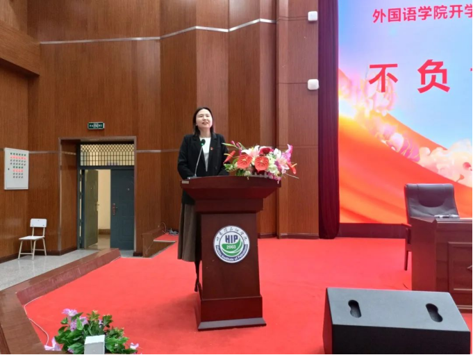 “党的二十大擘画了全面建成社会主义现代化强国和全面推进中华民族伟大复兴的宏伟蓝图,为新时代新征程党和国家事业发展,实现第二个百年奋斗目标指明了前进方向、确立了行动指南,也为当代青年勇担历史使命,以美的创造服务人民和社会主义文化强国建设指明了前进方向。”孙晓萍以“不负时代 不负华年”为题,总结了全院师生在校党委的领导下深入学习宣传贯彻党的二十大精神,团结一致踔厉奋发;带领外国语青年学子共同回顾了全院师生一起走过的抗疫路,深刻感悟国家“人民至上、生命至上”的价值坚守,鼓励学生要有实力、有底气、有斗志,以优异成绩奔赴春暖花开,努力书写新时代青年学子的奋斗篇章。