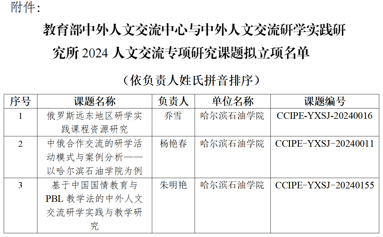 2024年10月8日,我院乔雪、杨艳春和朱明艳3名教师获批教育部中外人文交流中心与中外人文交流研学实践研究所2024人文交流专项研究课题,共计3项。