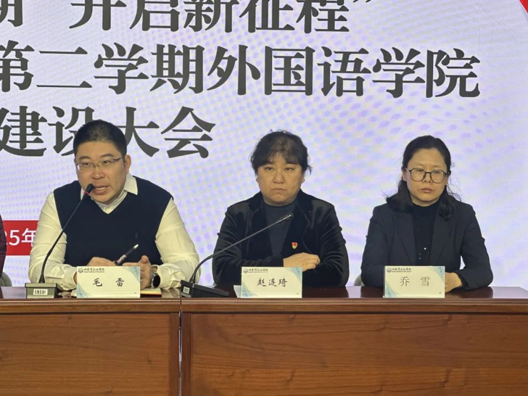 为贯彻落实学校新学期工作要求,扎实推进新学期学风建设工作,2月25日,外国语学院于主教学楼518报告厅召开学风建设大会。全院师生满怀憧憬与期待,齐聚一堂,共同迎接新学期的到来,开启知识探索与成长的新征程。院长王丽娅,党总支书记毛雷,副院长高丽娜,英语系主任王兴刚,俄语系主任乔雪以及学院全体学生参加,会议由团总支书记赵连琦主持。