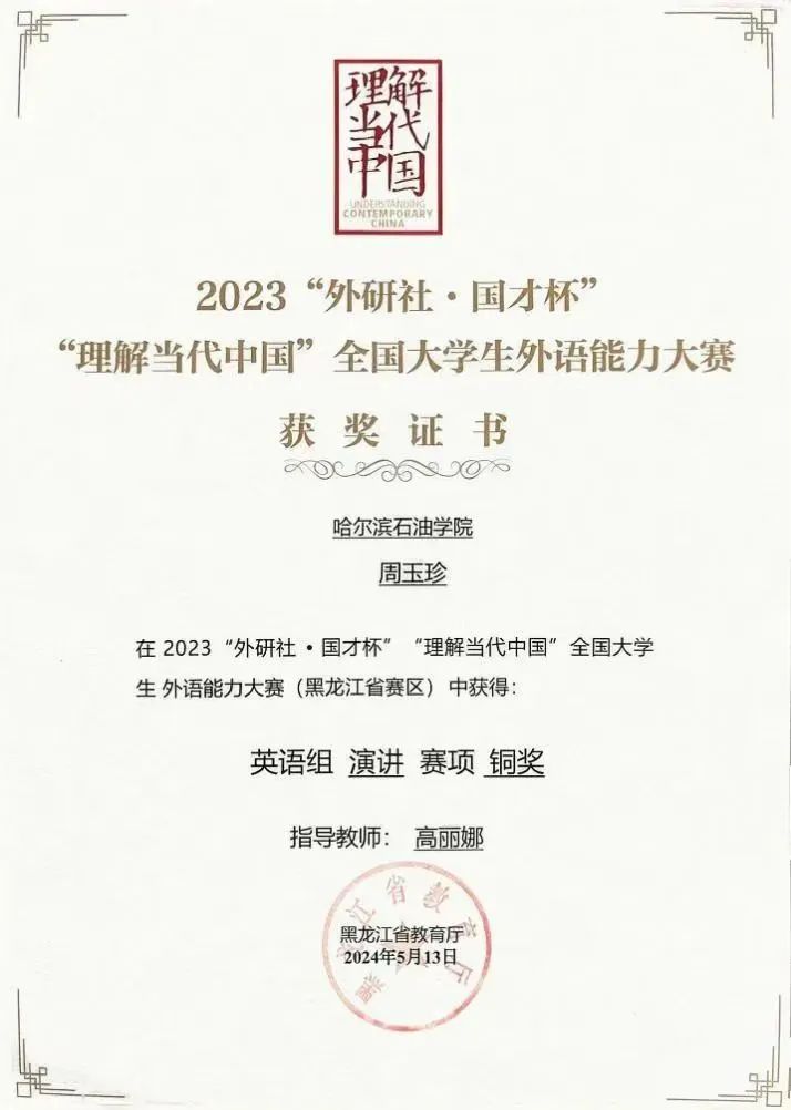 周玉珍作为我院学生的优秀代表,始终以卓越的表现诠释着外院学子的风采。她是国家级奖学金“大满贯”获得者,多次获评国家奖学金、国家励志奖学金。在学术竞赛领域,她更是成绩斐然,累计获得7项国家级学术竞赛奖项、1项省部级奖项及12项校级荣誉。在第七届全国大学生外语水平能力大赛、全国大学生英语词汇智慧学习大赛、全国创新创业能力大赛、高校文化强国杯挑战赛、全国职业发展大赛均荣获一等奖!她在外语能力、职业规划、创新创业、跨文化研究等多个领域全面发展,成为当之无愧的“全能型学术新星”。