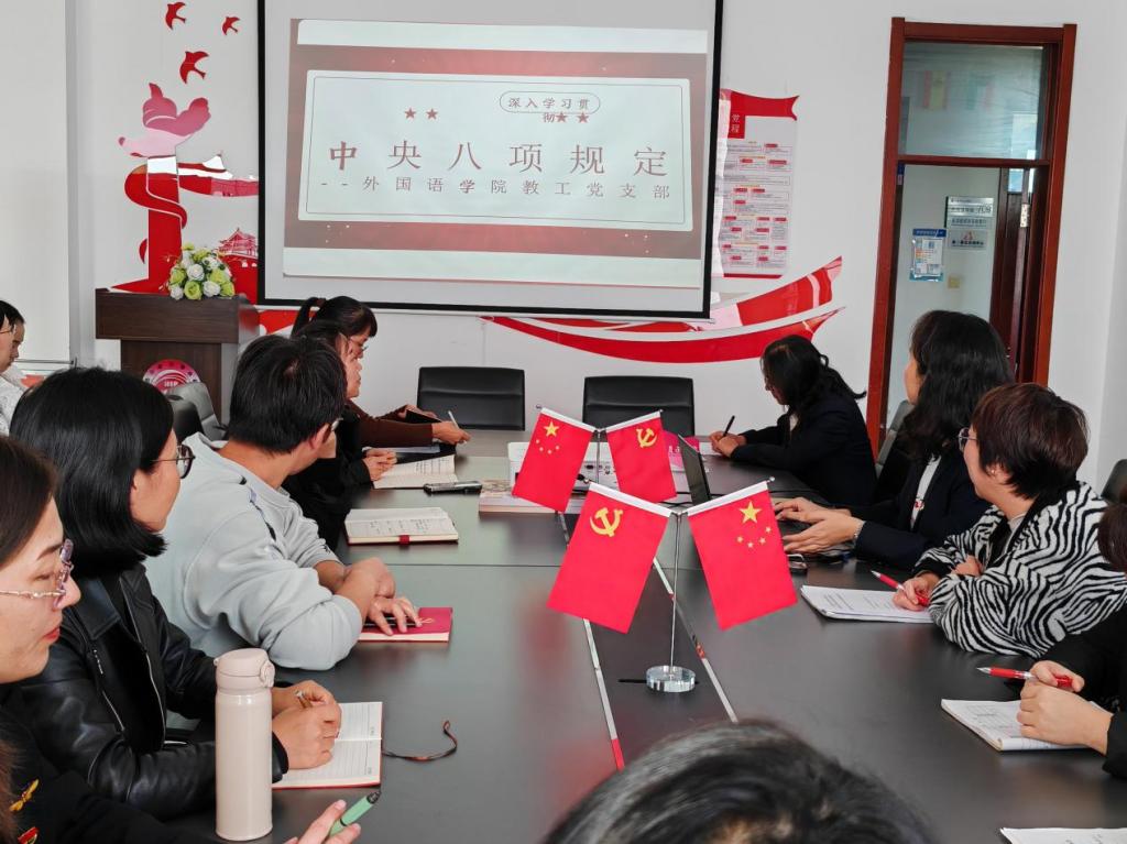 2025年4月29日下午,外国语学院教工党支部在党员之家召开党员大会,专题学习《中共中央八项规定》及《中央八项规定实施细则》。会议由党支部书记杨艳春主持,全体教工党员参加。