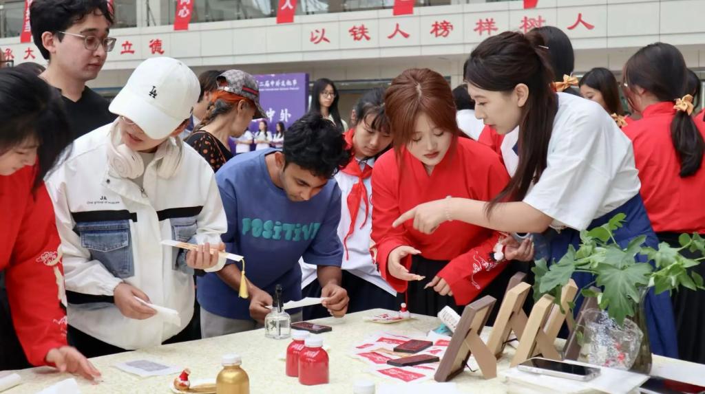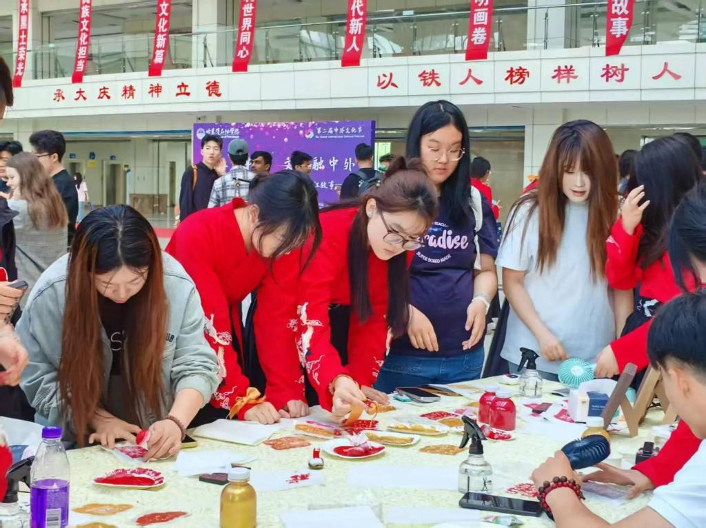 传统文化体验区成为中外师生互动的鲜活课堂。在铁人精神展示区,纪录片与知识问答带师生回溯石油人奋斗史;活字印刷体验中,学生亲手制作“石油魂”主题书签,感悟传统技艺与现代叙事的融合;多语种书签制作区,中国学生传授书法技巧,“北大仓”等地域文化关键词以英、俄等文字与水墨笔触相映成趣。手工剪纸融入俄罗斯套娃元素,手绘曼陀罗创作兼具艺术疗愈与文化寓意,六大体验项目构建起“黑土精神为魂、国际表达为翼”的文化交融场域。